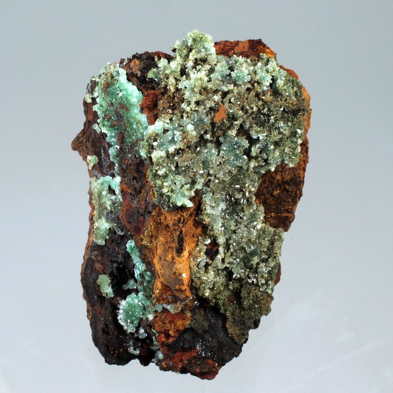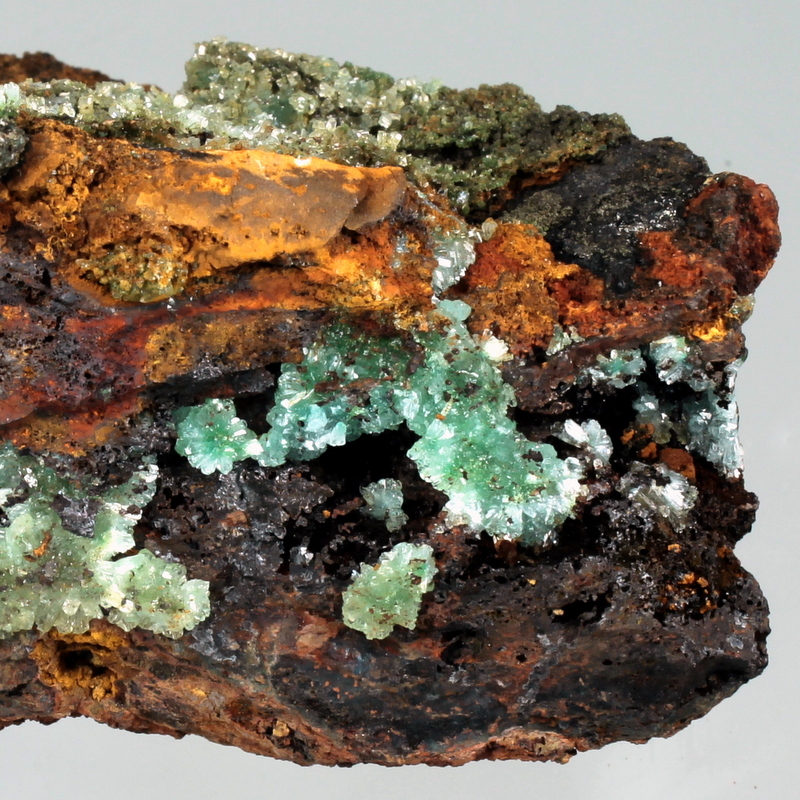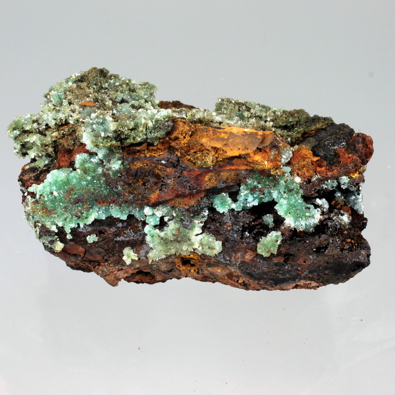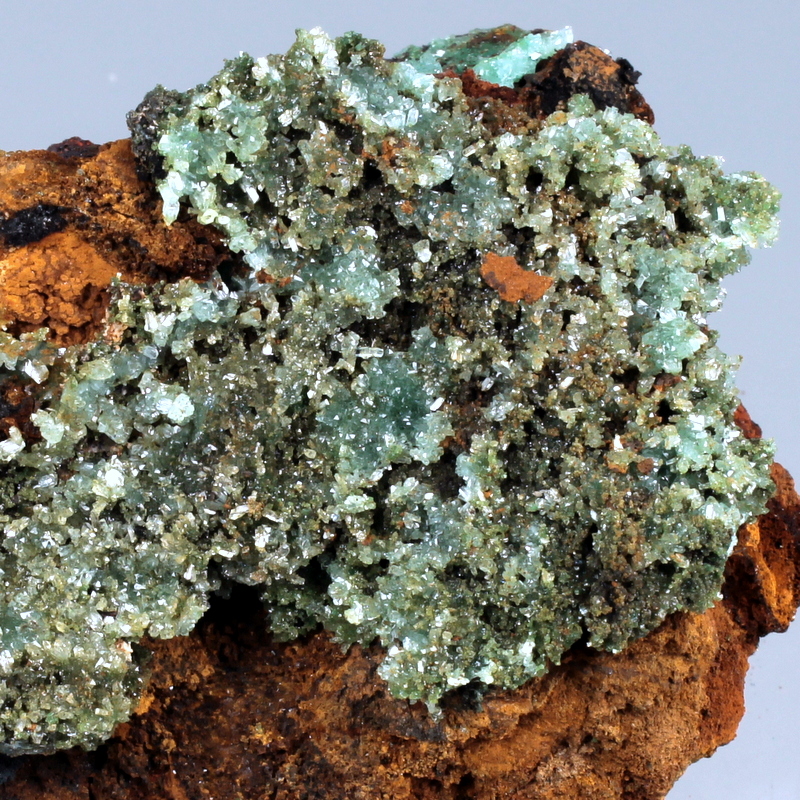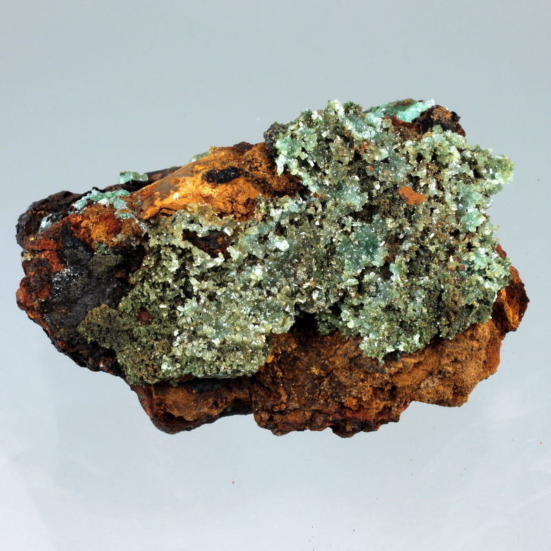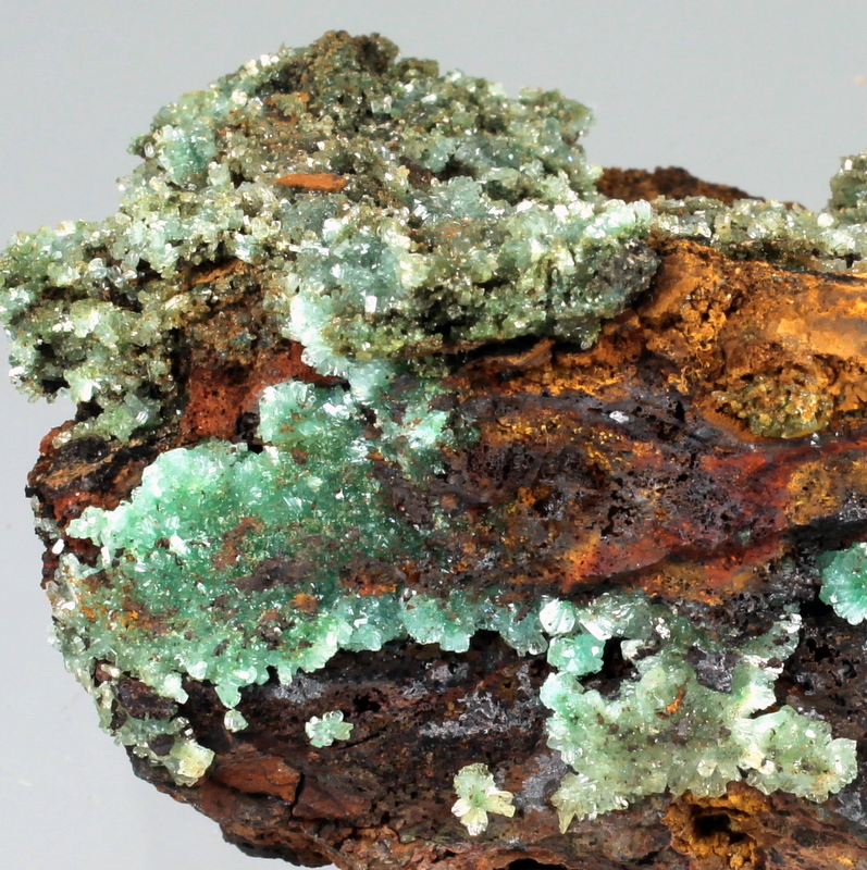 Very interesting specimen of transparent two-colored adamite crystals of high glassy luster on limonite matrix. Change in color is due to different Cu ions content in adamite crystals.