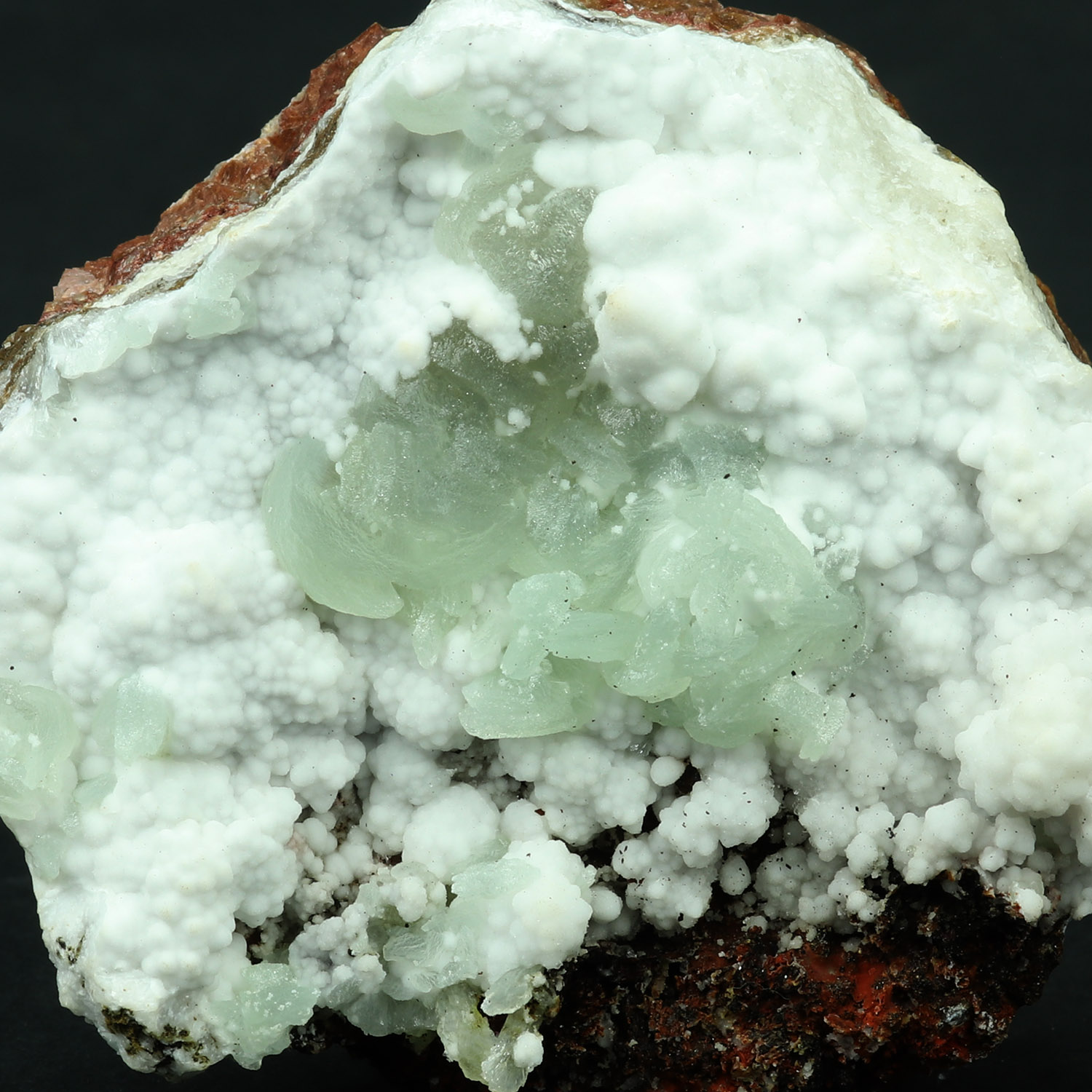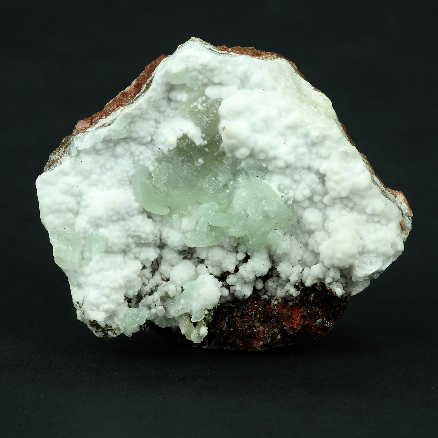 Good specimen with pastel green, gemmy adamite on white calcite from the legendary 2017 find in the Christiana mine.