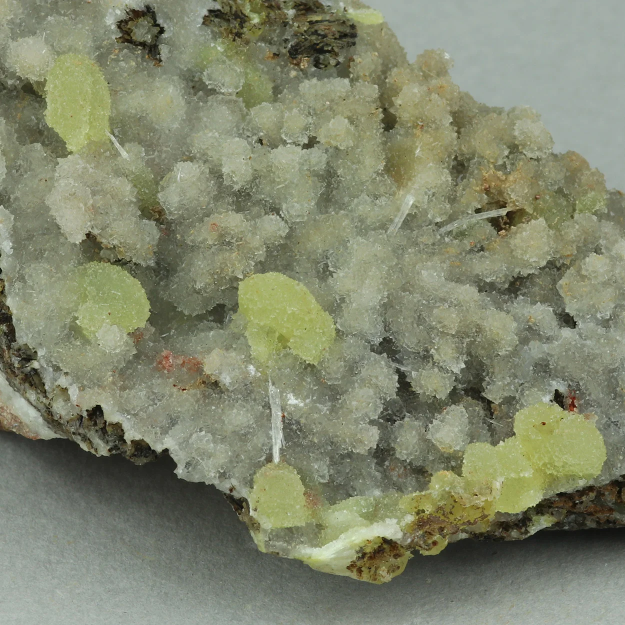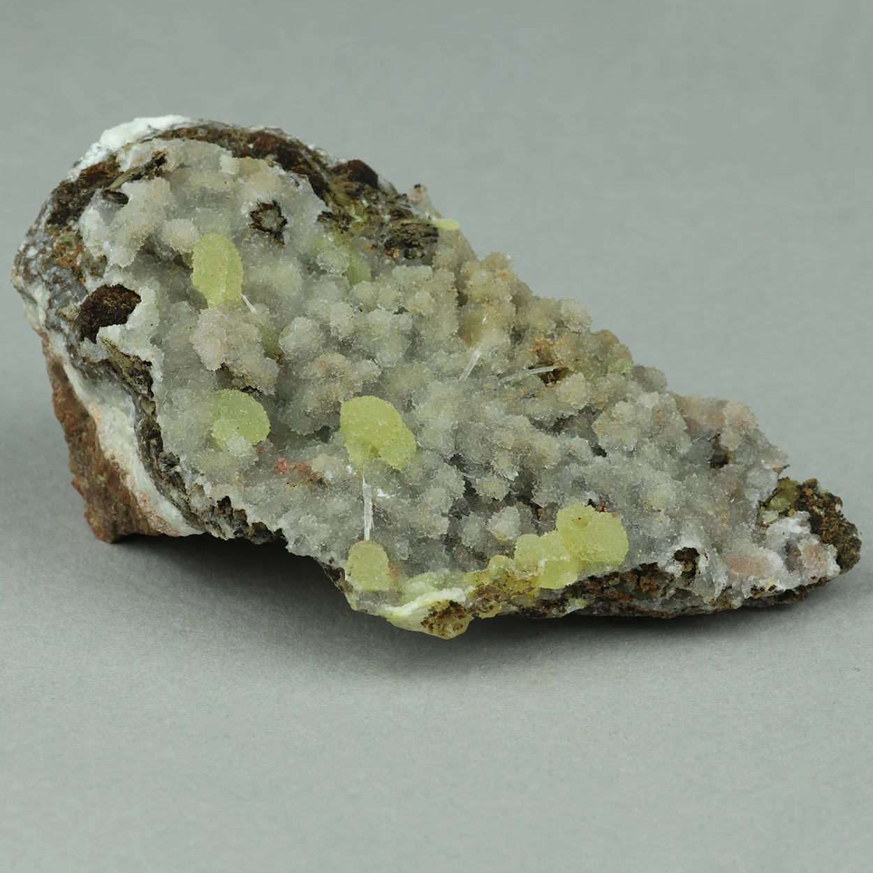 Good, representative example of yellow adamite on calcite from the famous find of 2017. From my personal collection, #174.