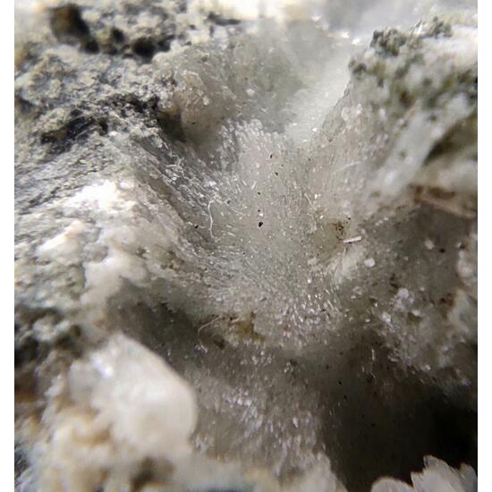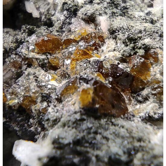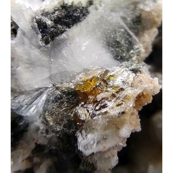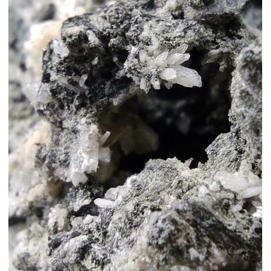 Calcite - CaCO₃ Feldspar - XAl(1-2)Si(3-2)O8 Ferro-actinolite - □Ca₂Mg₂.₅-₀Fe₂.₅-₅Si₈O₂₂(OH)₂ Prehnite - Ca₂Al(Si₃Al)O₁₀(OH)₂ Titanite - CaTiSiO₅