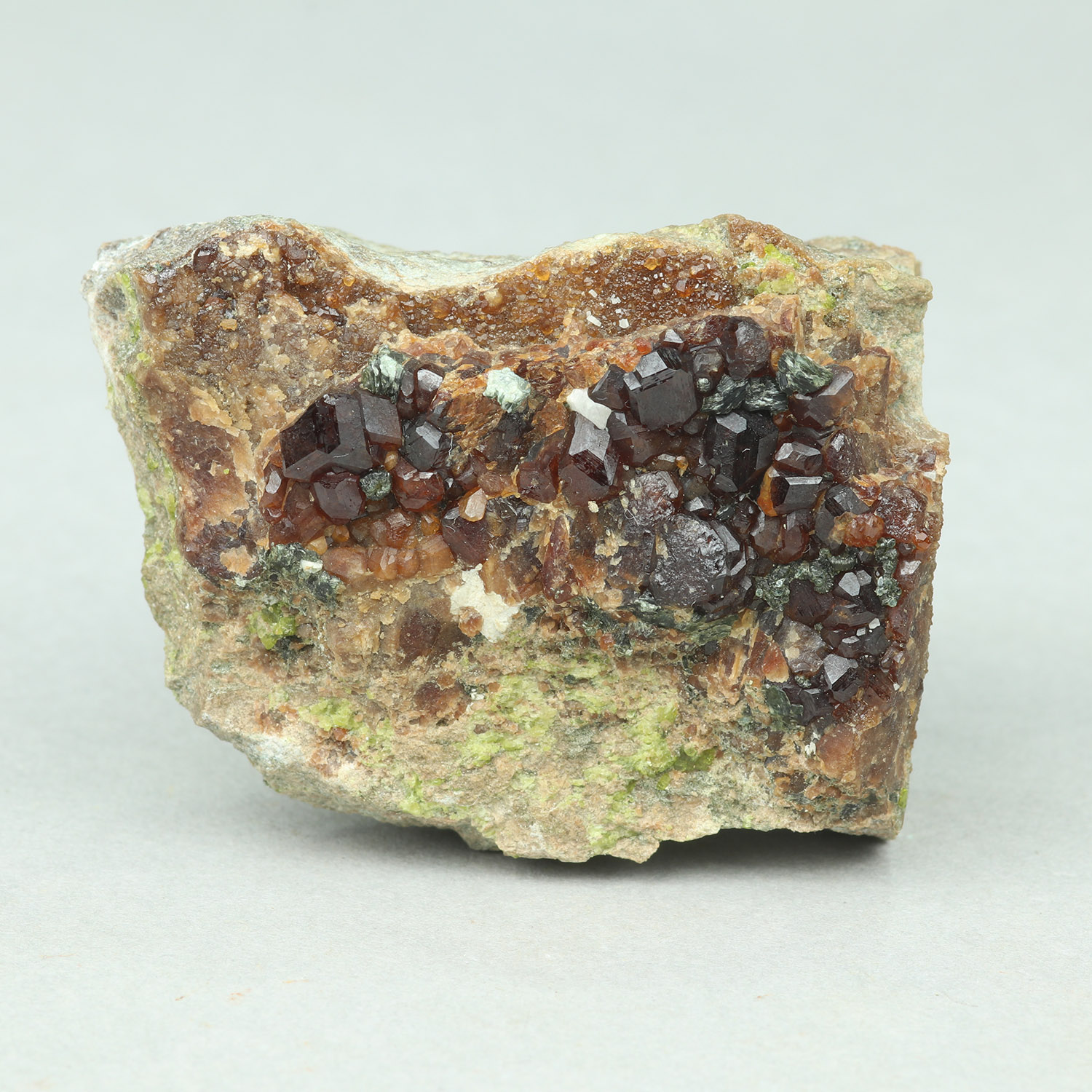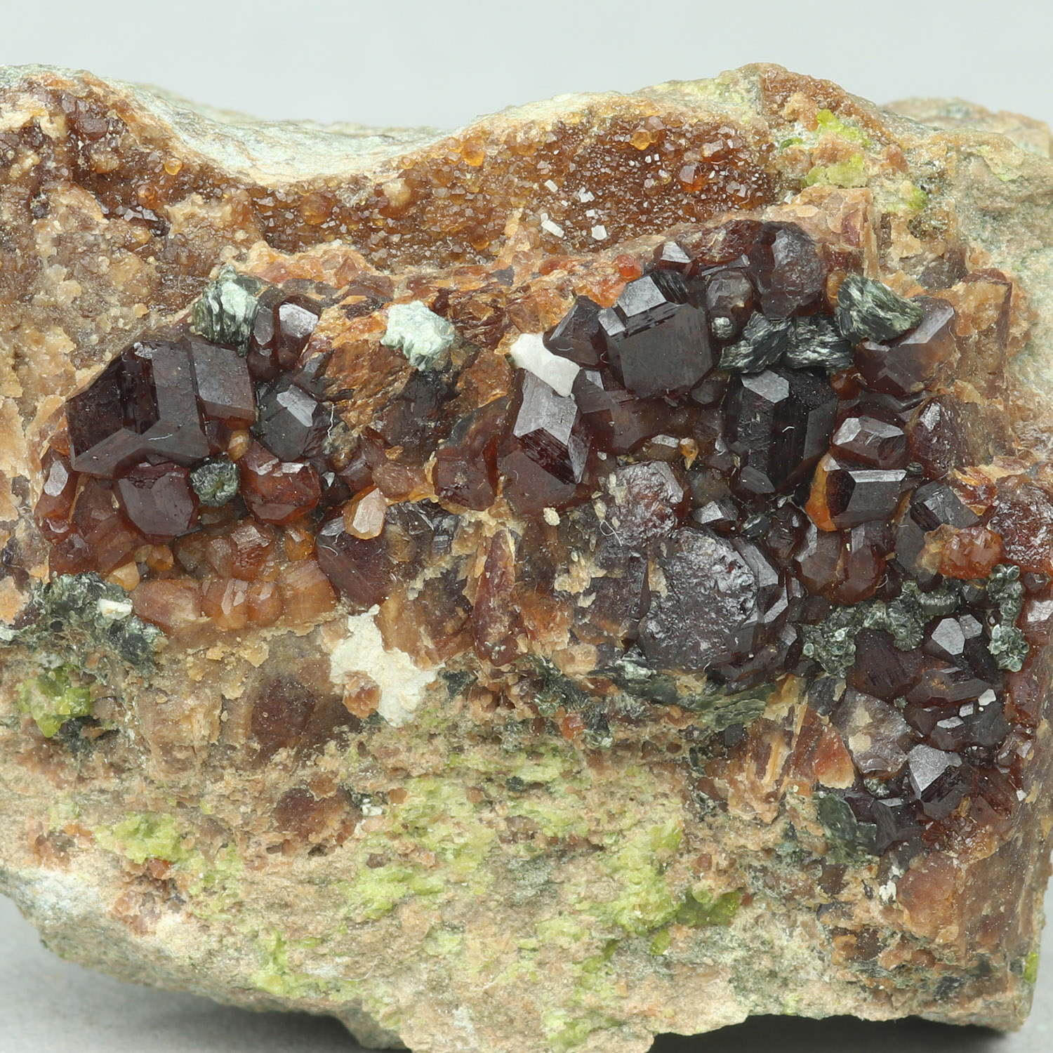 Interesting and unusually good quality andradite from Serifos with gemmy, lustrous reddish crystals on matrix.