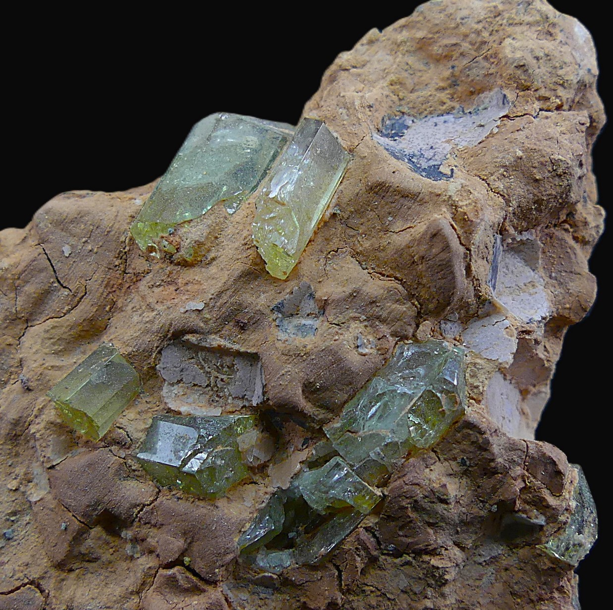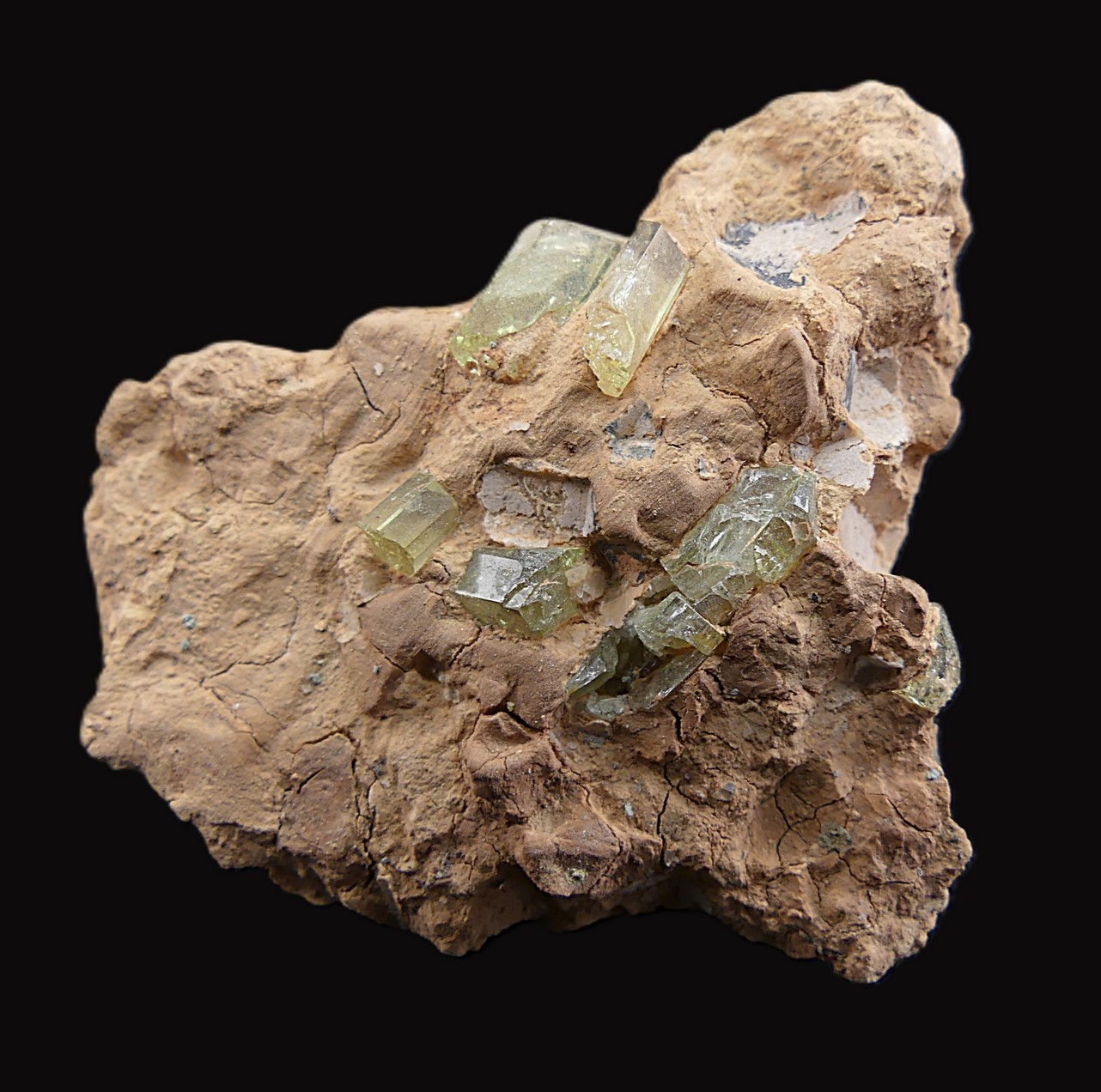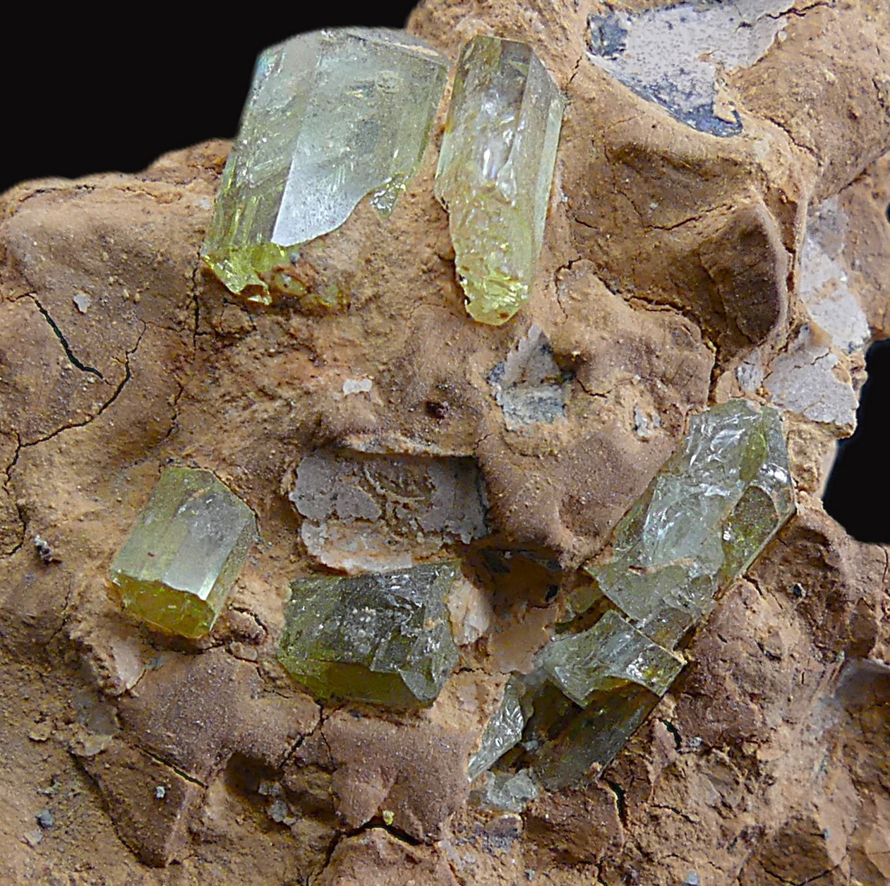 Group of yellow apatite crystals with great transparency scattered in a clay matrix, from the interior of a lamproite geode from the famous mine located among the remains of the volcanic cone of La Celia, in Jumilla.