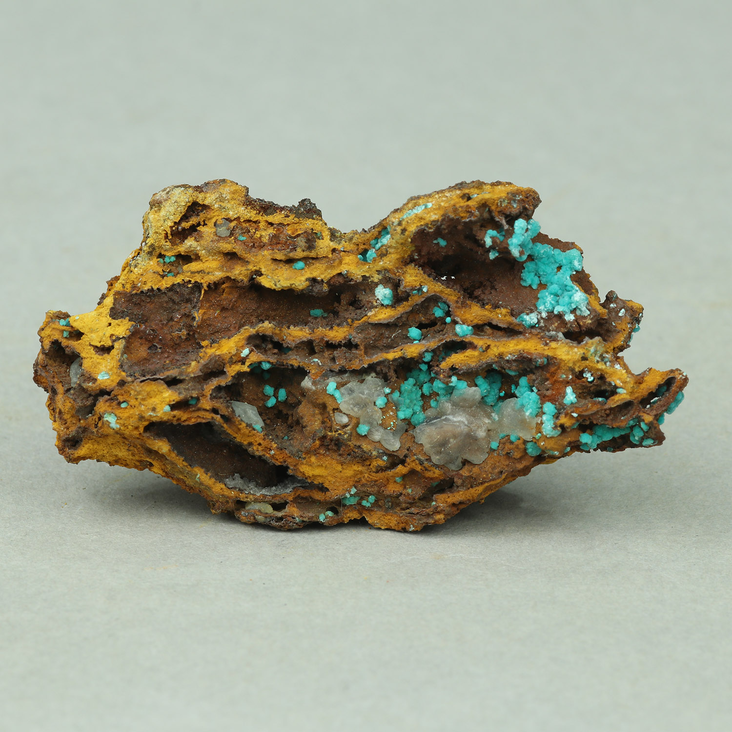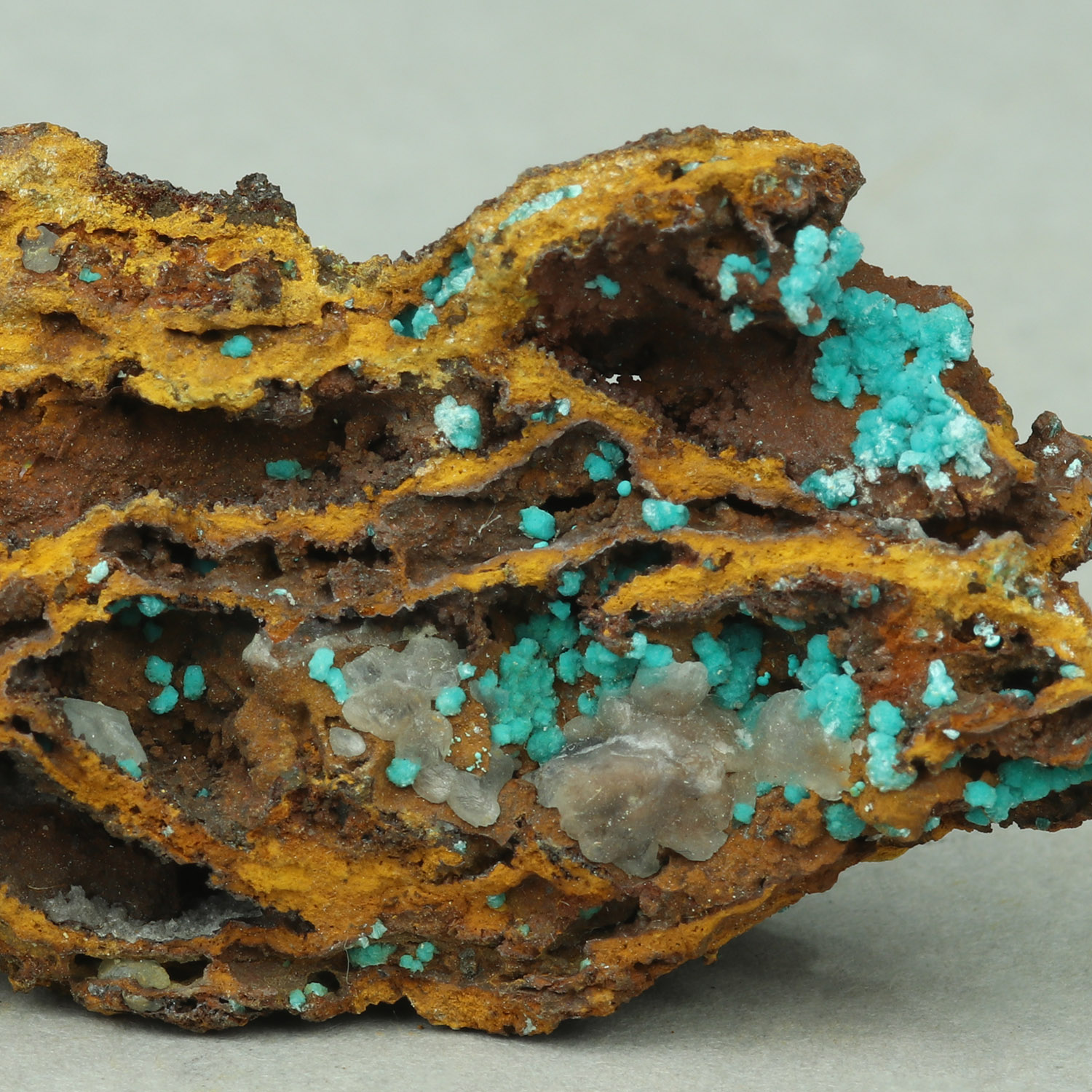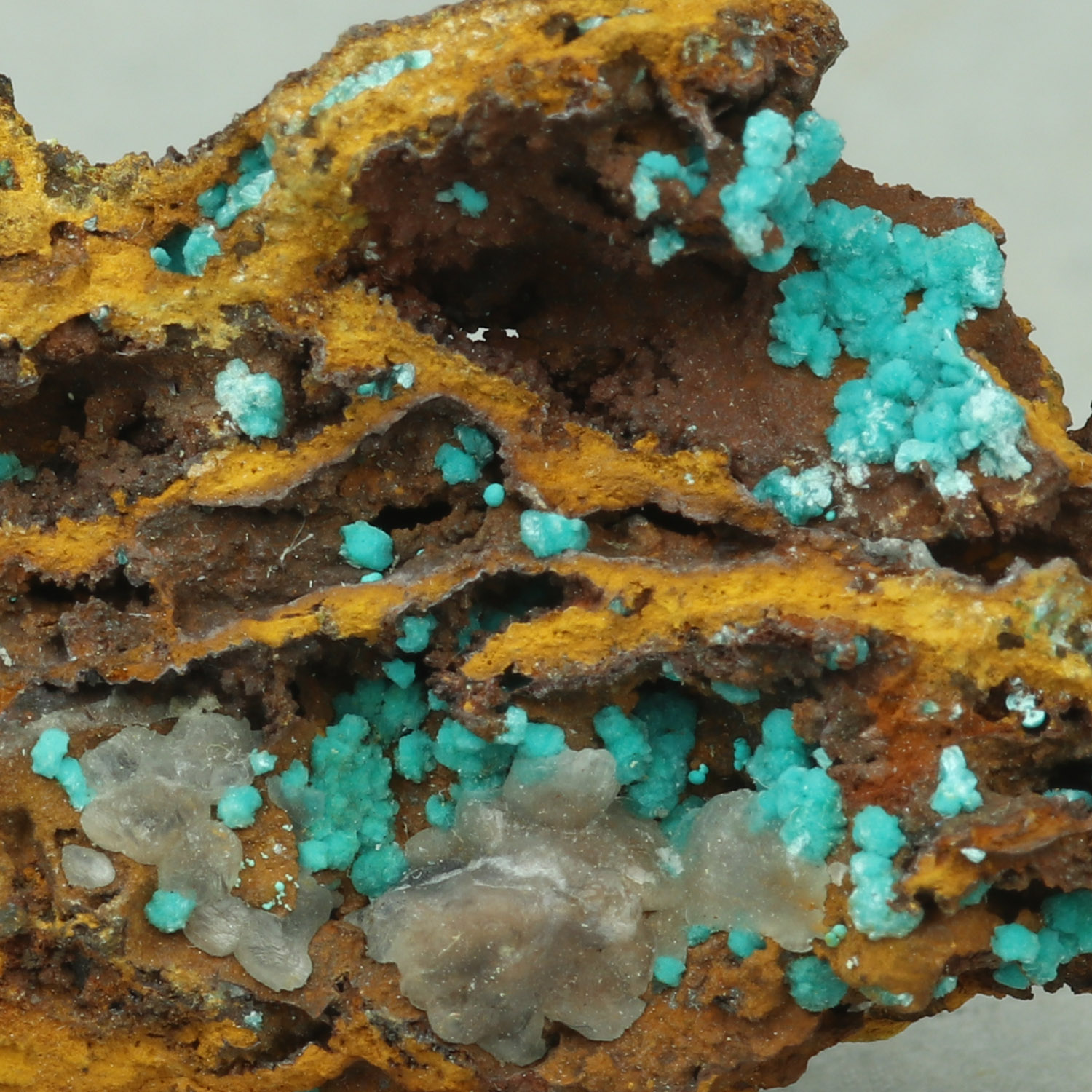 Classic old timer from Lavrion with blue aurichalcite crystals on limonitic matrix, associated with minor calcite.