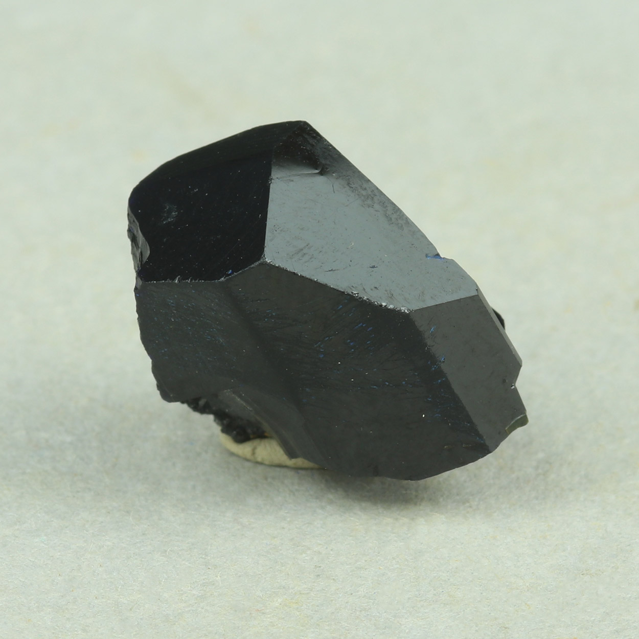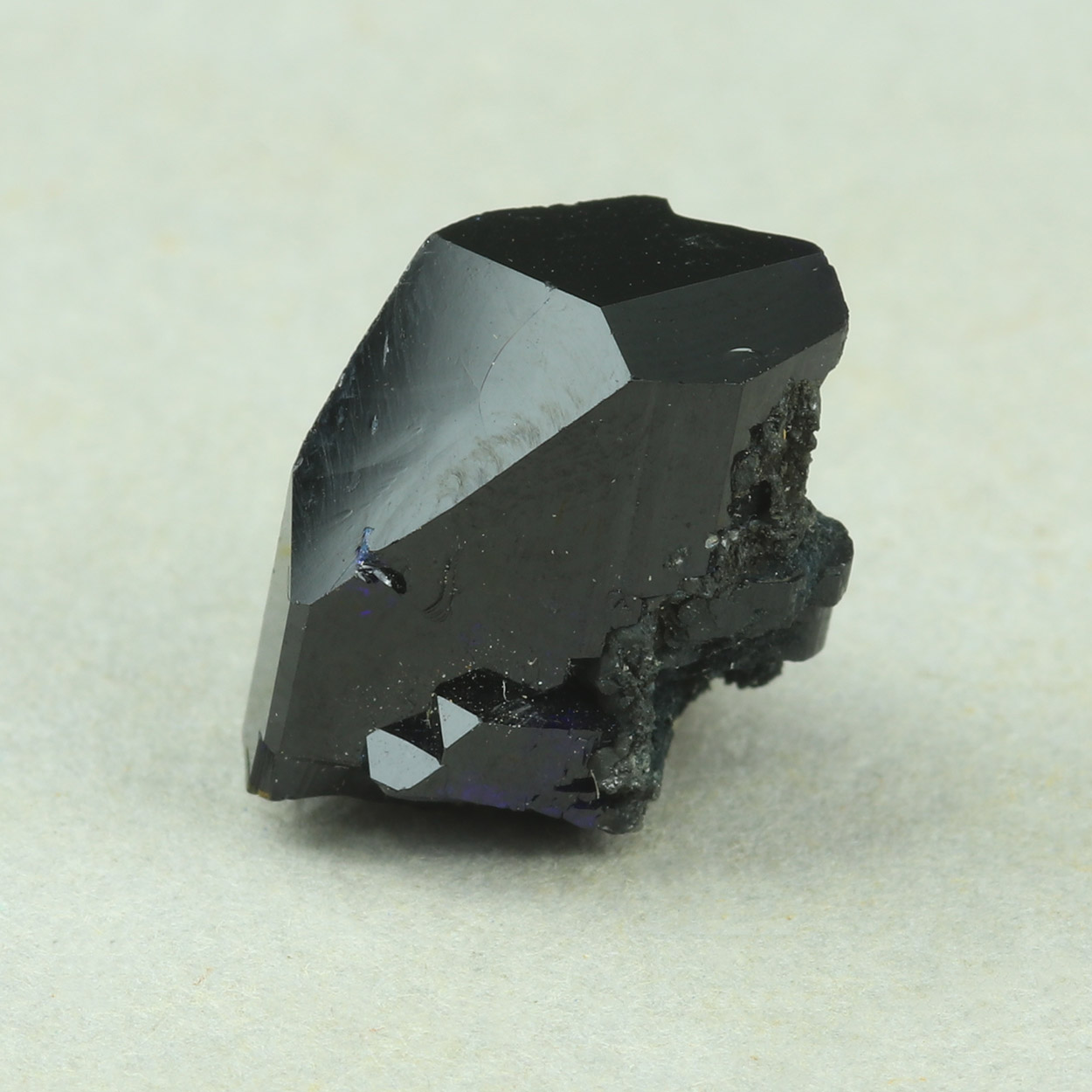 Razor sharp and very lustrous crystal of azurite. A fine thumbnail of the species.