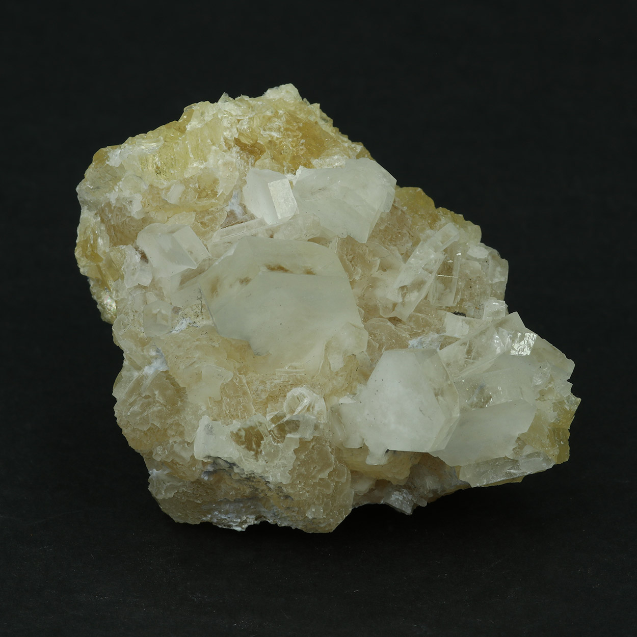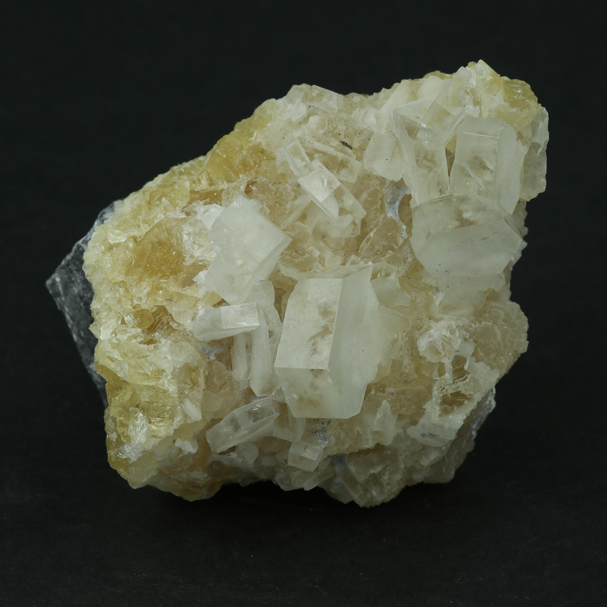 Gemmy, hexagonal calcite crystals on matrix, with partially white faces.