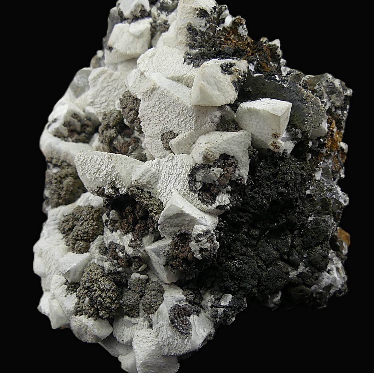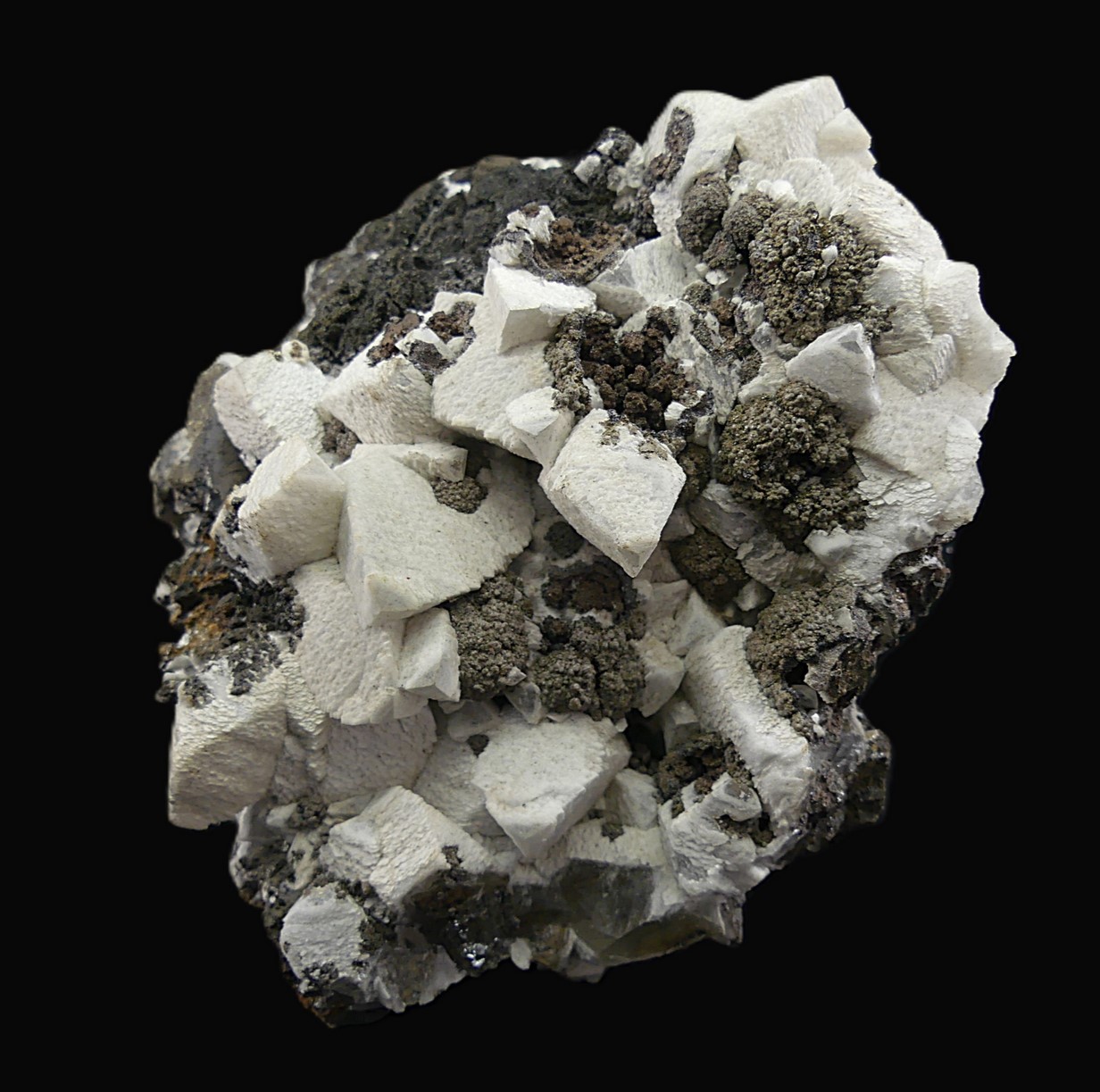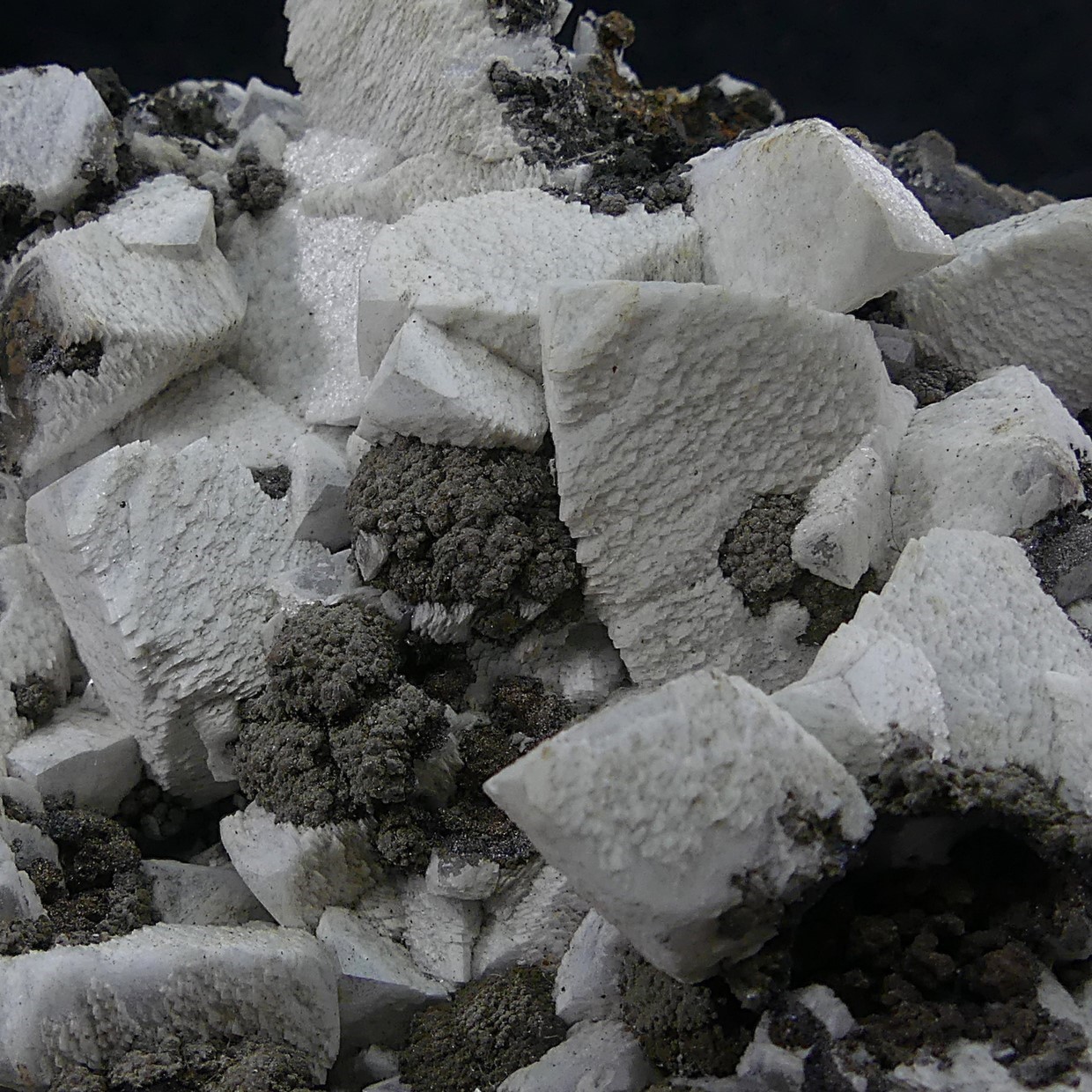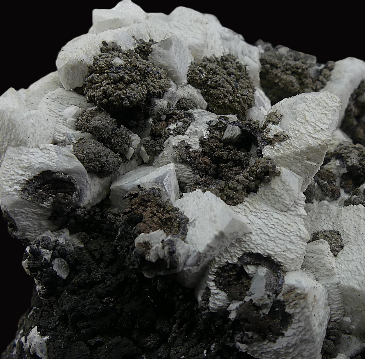 Group of colorless calcite crystals covered by a second generation of flaky-looking, opaque white crystals. The crystals are intergrown with botryoidal groups of todorokite and other manganese oxides in a goethite matrix. This type of flaky and opaque crystallization is characteristic only of this mine, Mina Manolita (Minas Viejas), Sierra del Puntal, Cartagena, Murcia, Spain.