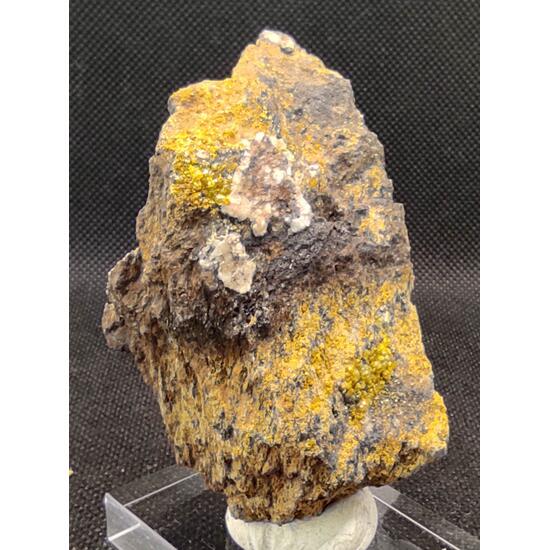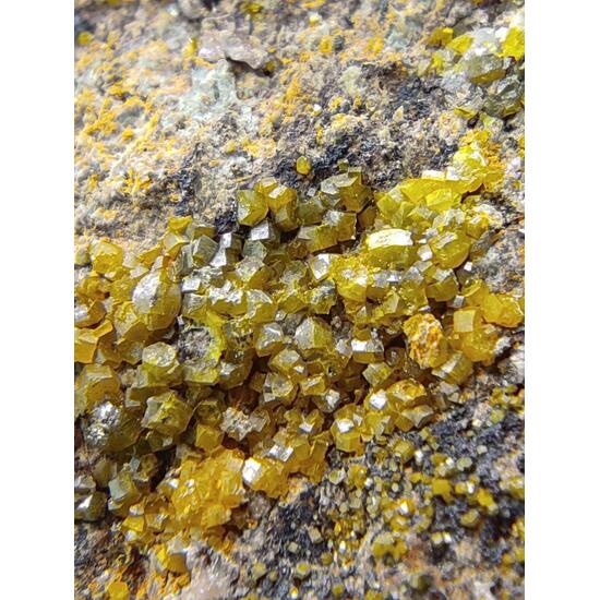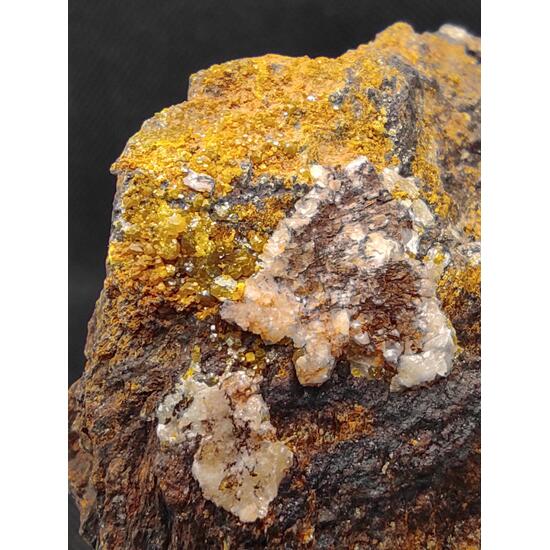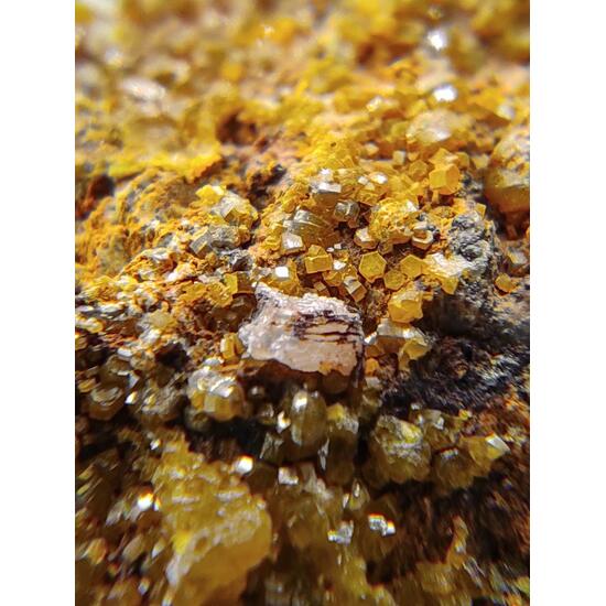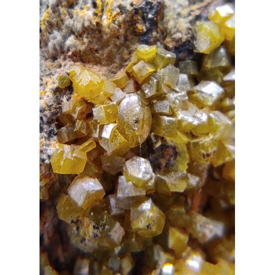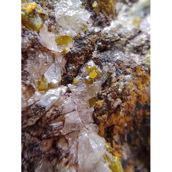 Precious specimen of Mimetite-Campylite crystals scattered on a goethite/limonite matrix, in addition to cerussite crystals. The crystals have a yellowish color and are barrel-shaped or prismatic. The specimen has been located in an area that is being covered by scoria and generally contains samples of beudantite crystals.