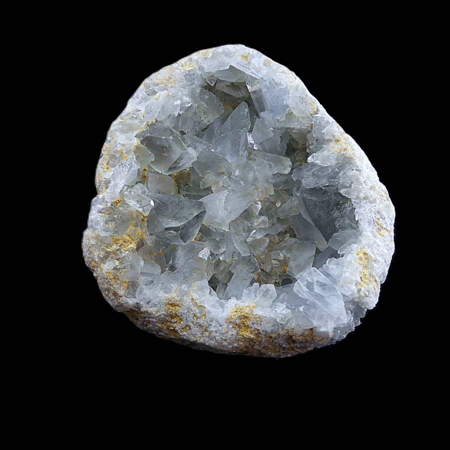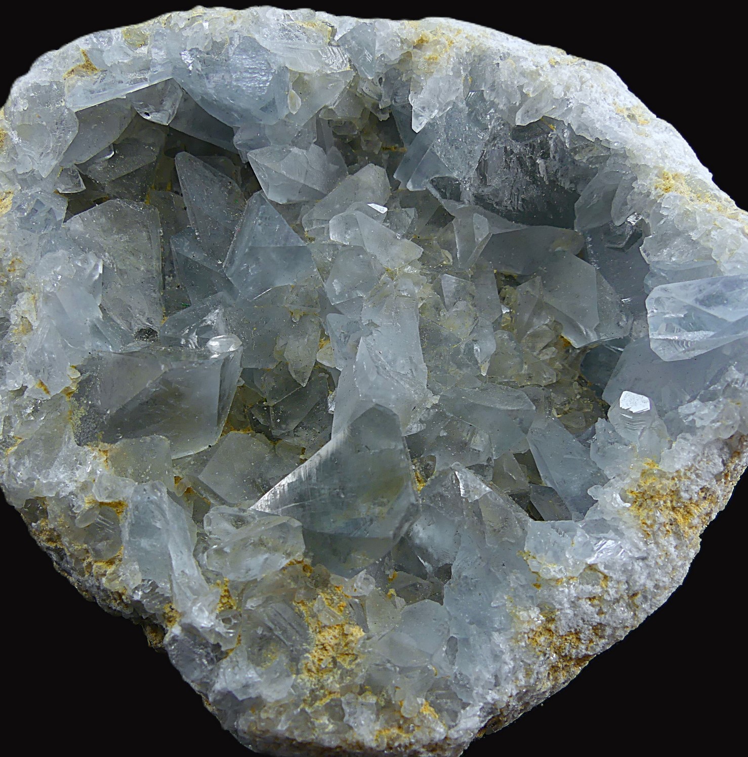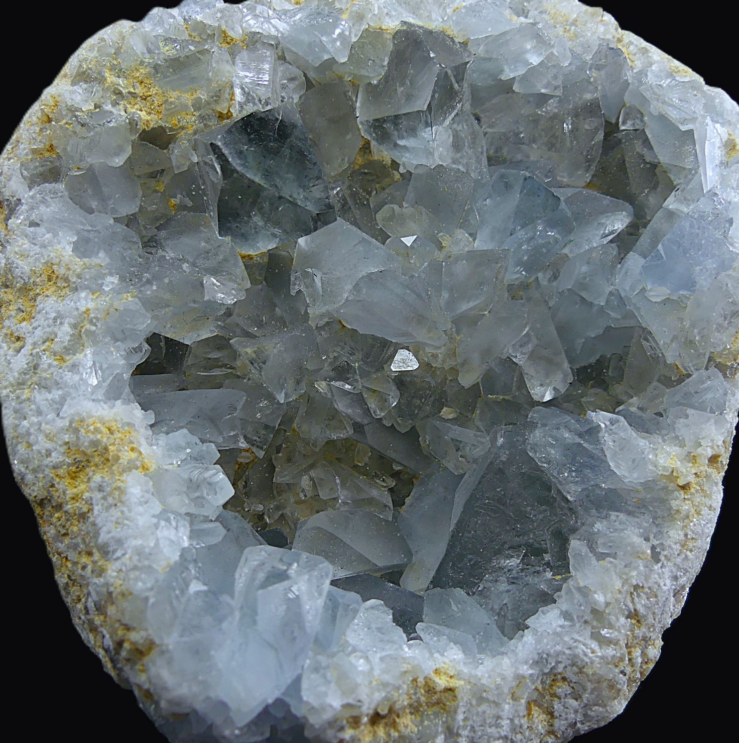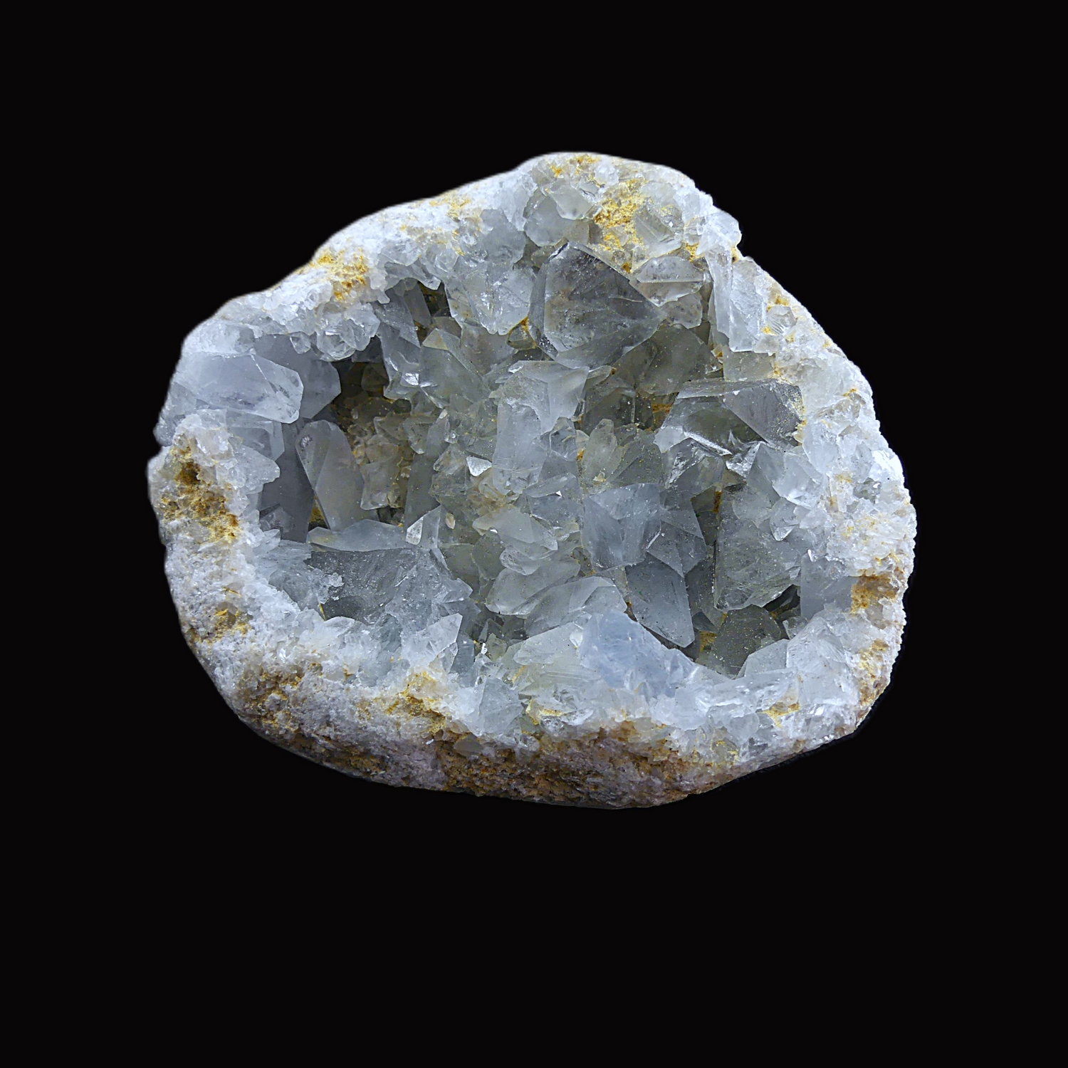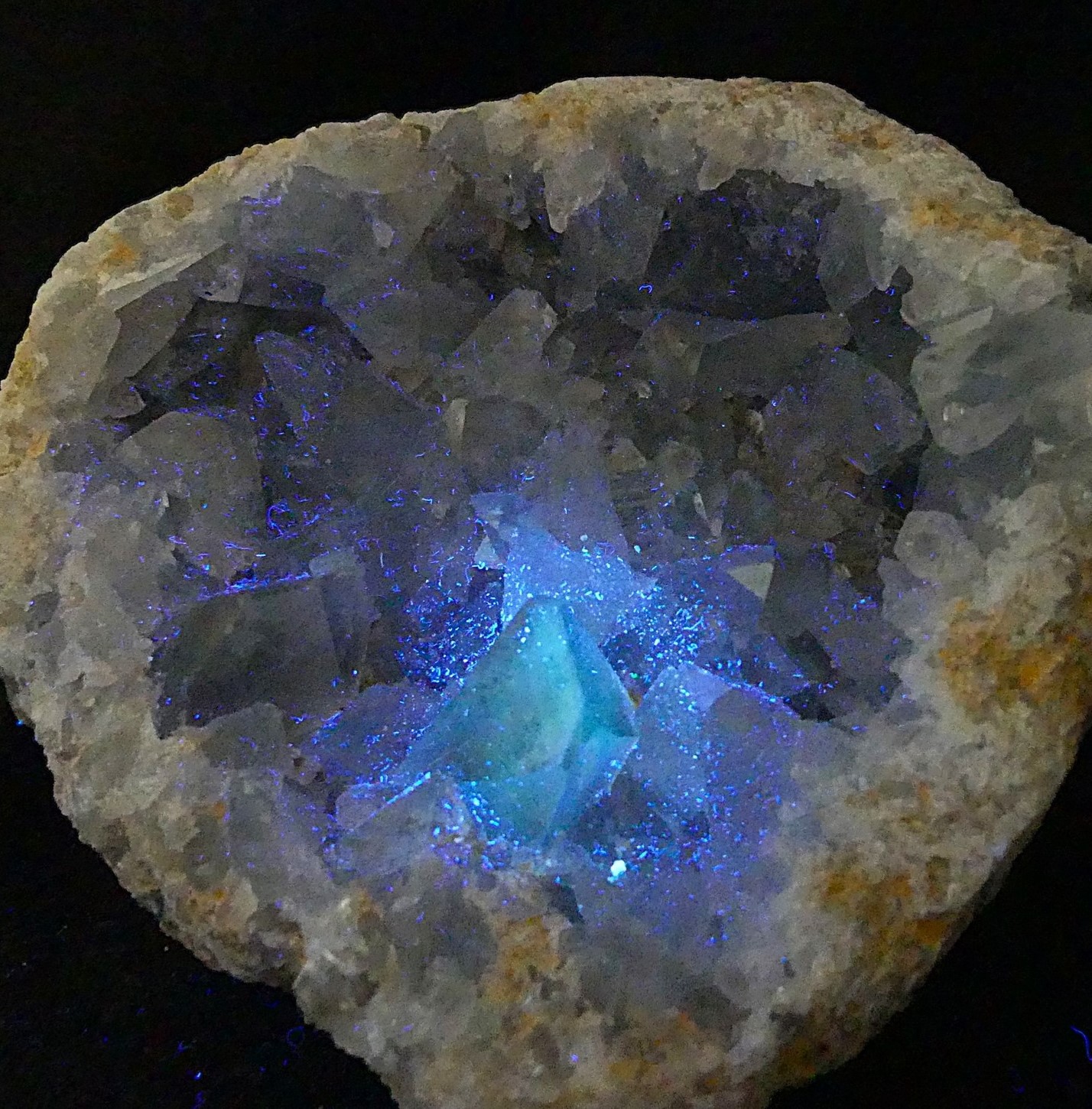 Very nice celestine geode filled with beautiful sky-blue crystals with a lot of shine and quality. Note that under the action of long-wave ultraviolet light, the celestine from this deposit is activated, giving a greenish color, quite different from Spanish celestines which usually give a yellowish-white color.