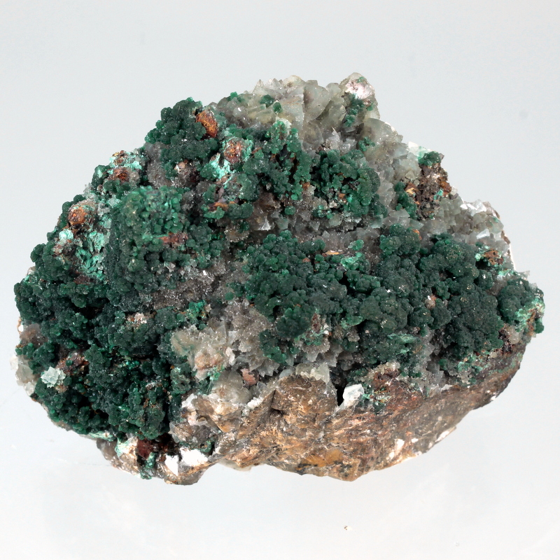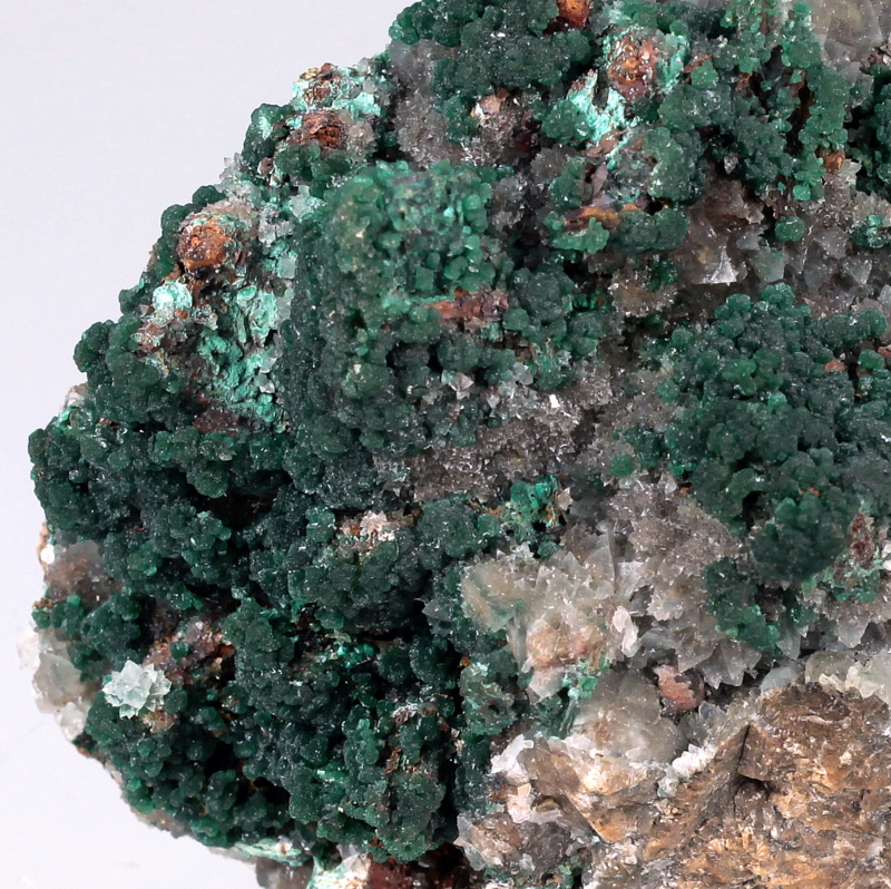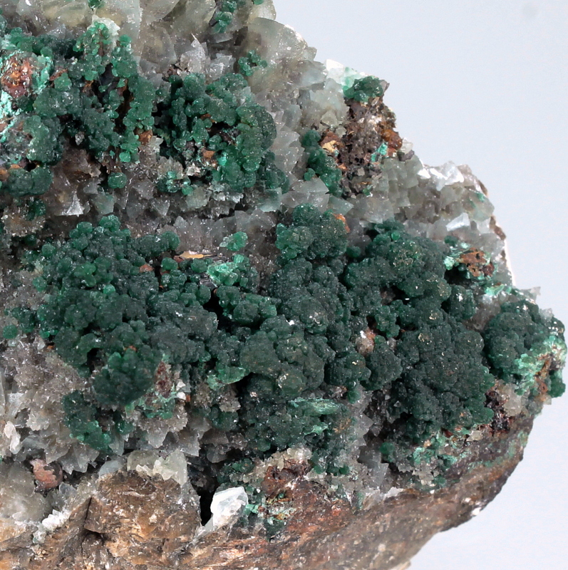 Dark green conichalcite crystals on a film of clear calcite that covers brown scalenohedral calcite crystals.
