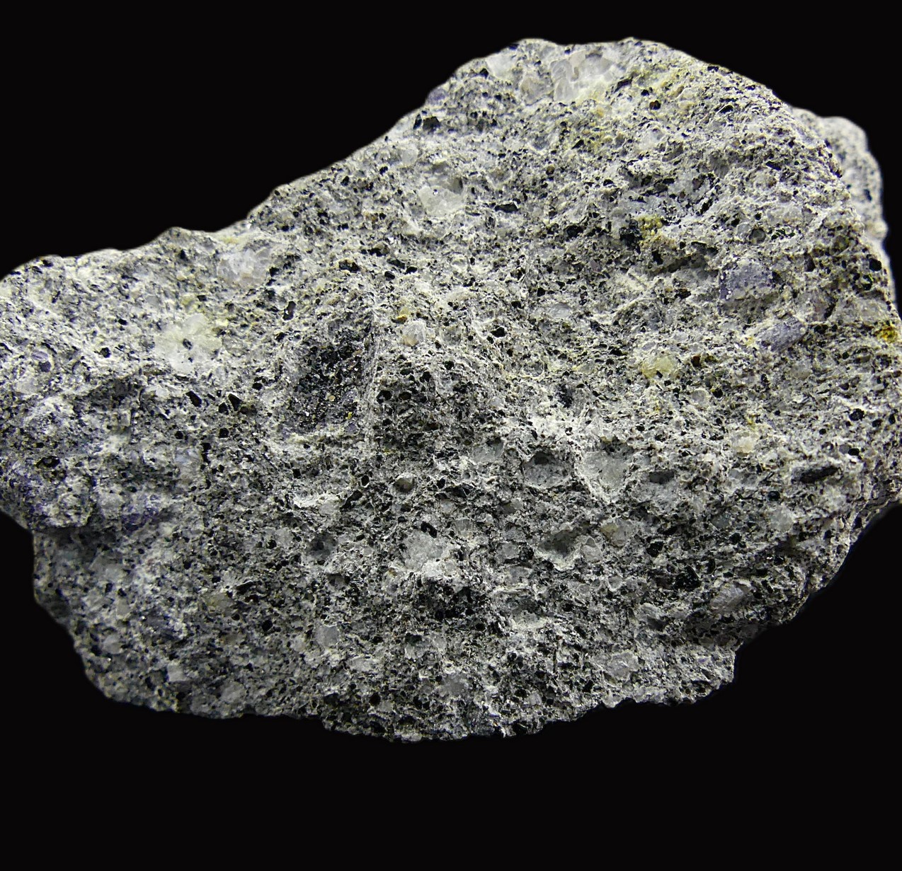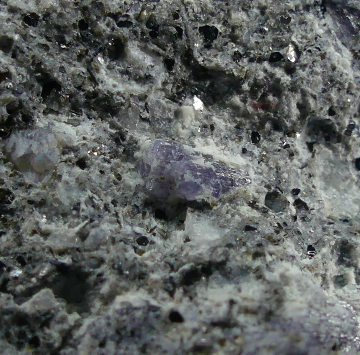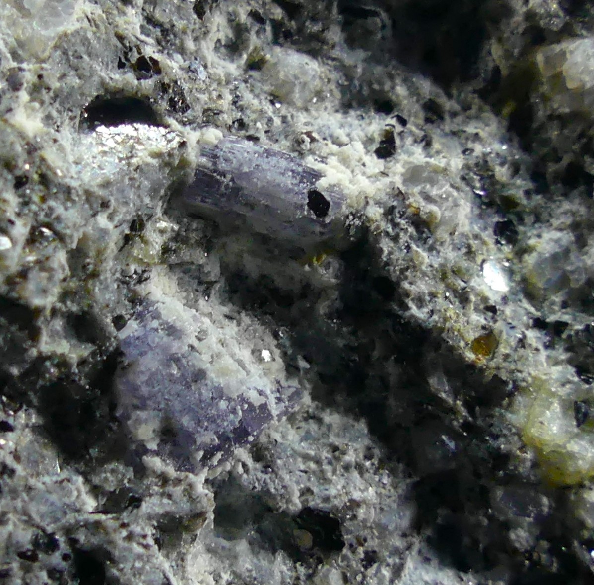 Violet-colored cordierite crystals in the form of hexagonal prisms disseminated in a rhyolite matrix; this deposit is the Type Locality for cordierite.