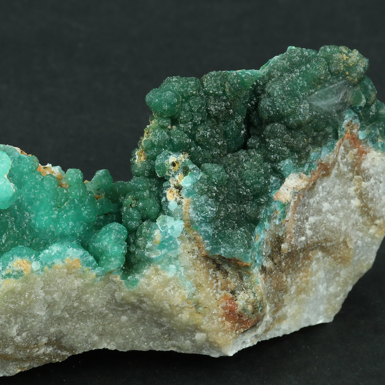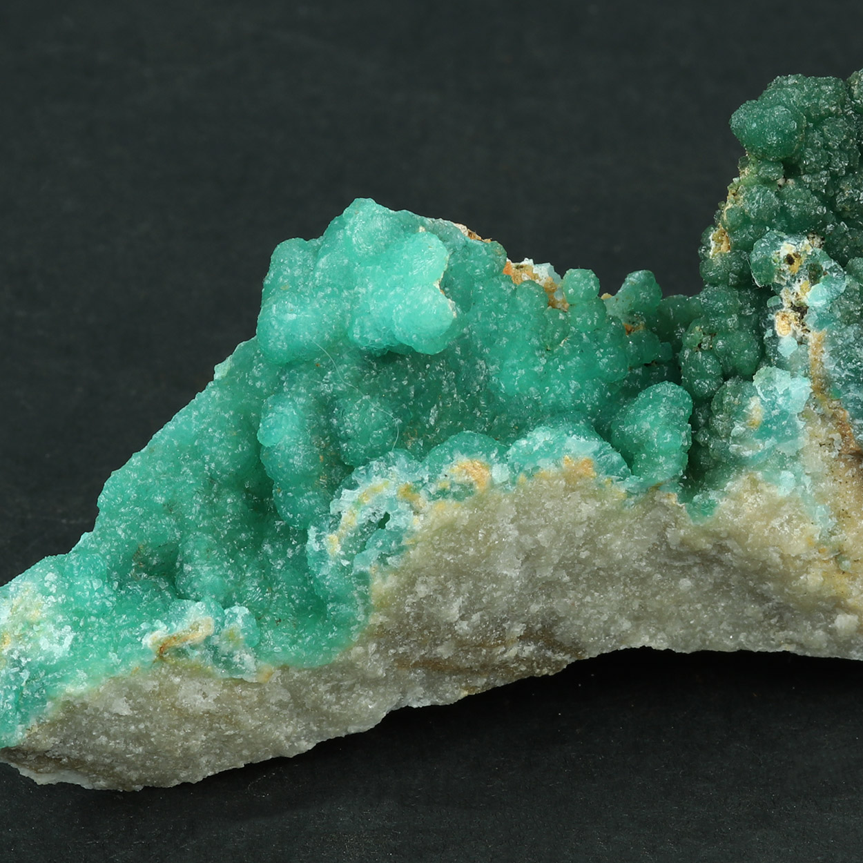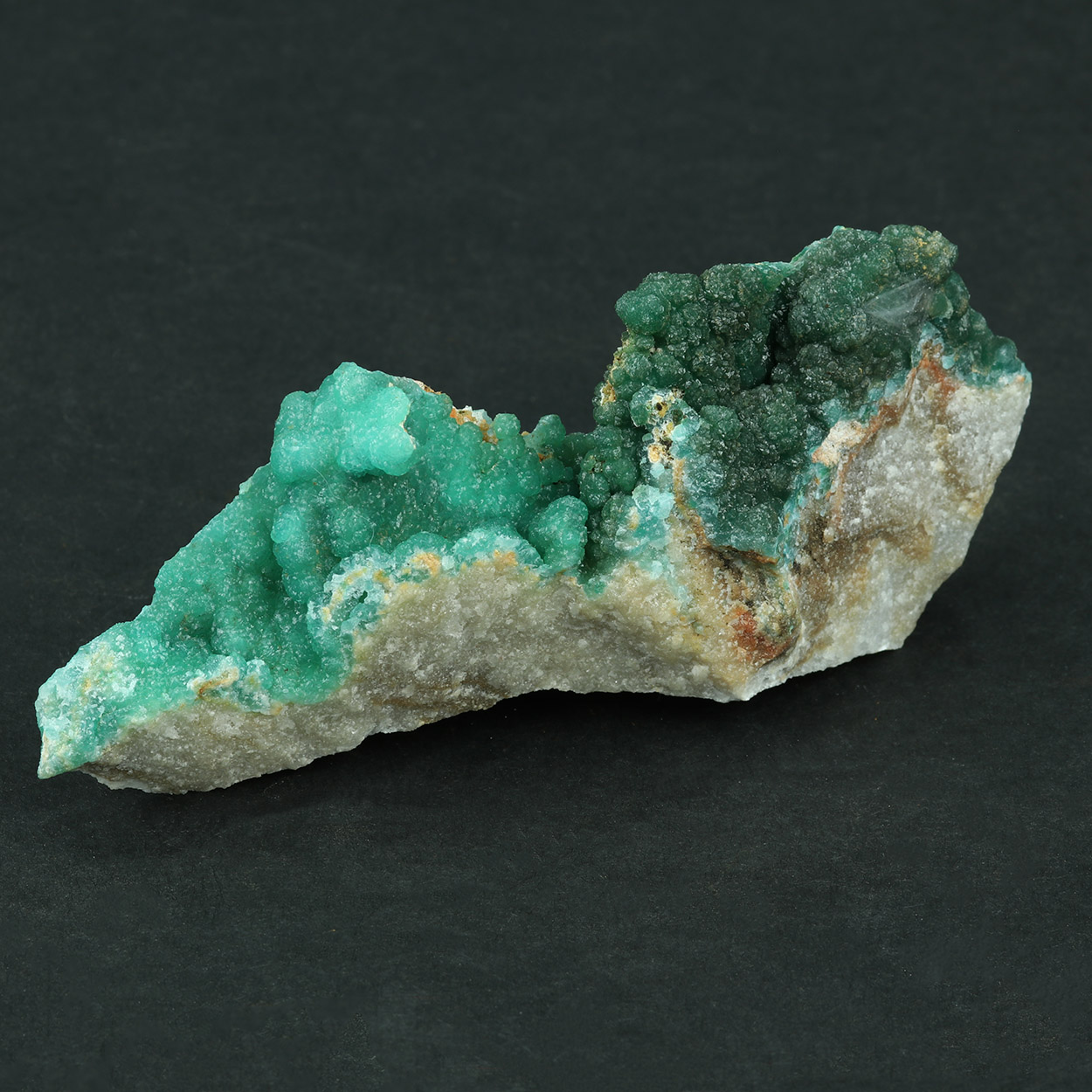 Good specimen with green curpian adamite in two color tones: A brighr blue-green one and a dark green one, on marble matrix.