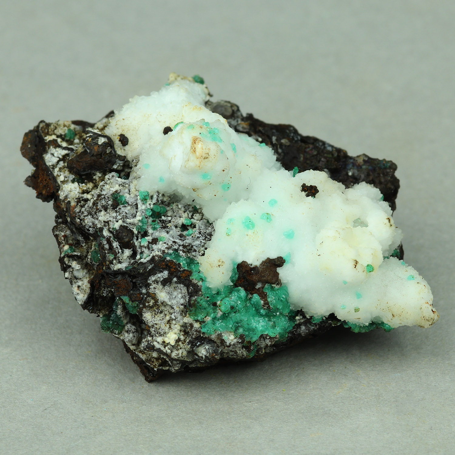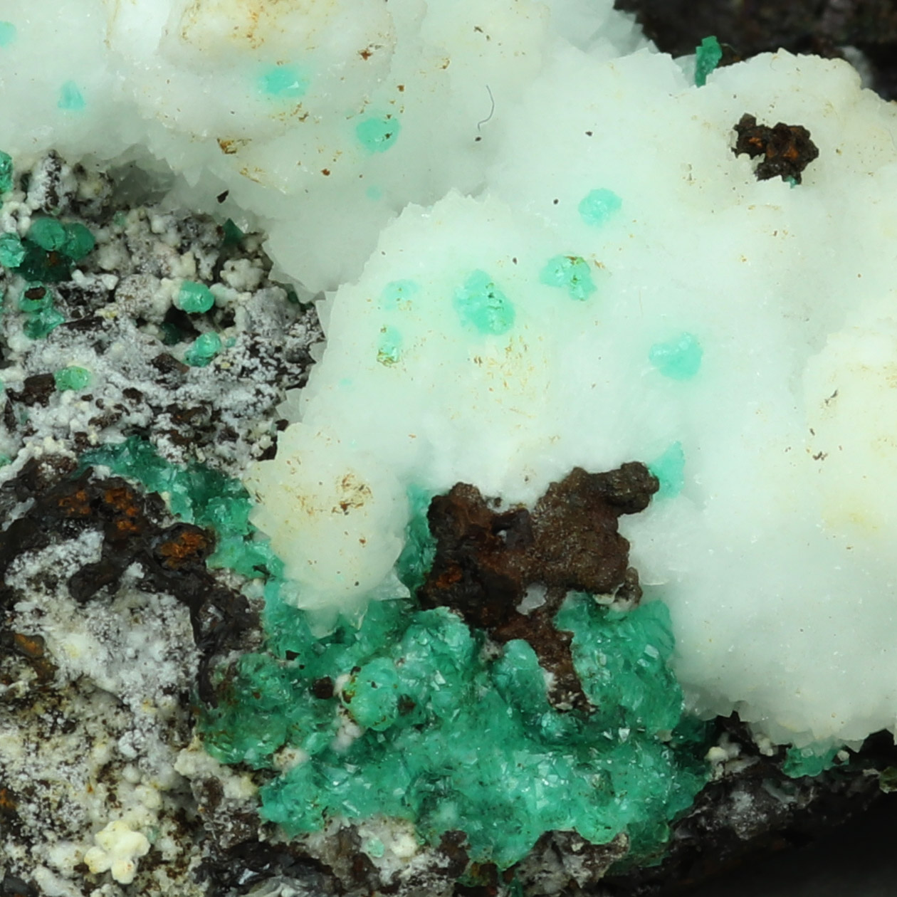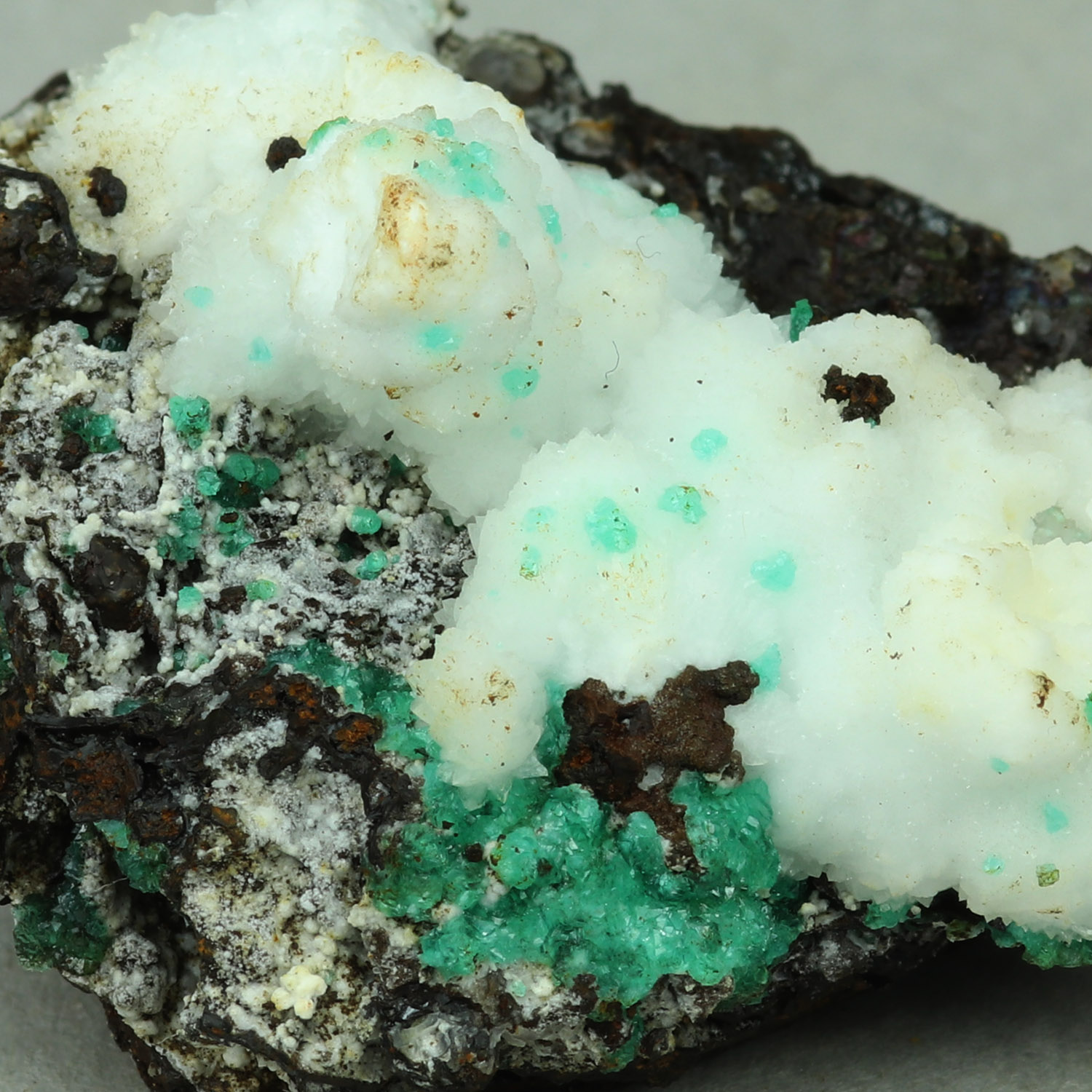 Old classic example of blue-green cuproadamite with white calcite on gossan matrix.
