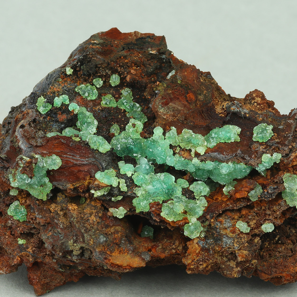 Gemmy and lustrous, green cuprian adamite crystals on contrasting, gossan matrix.