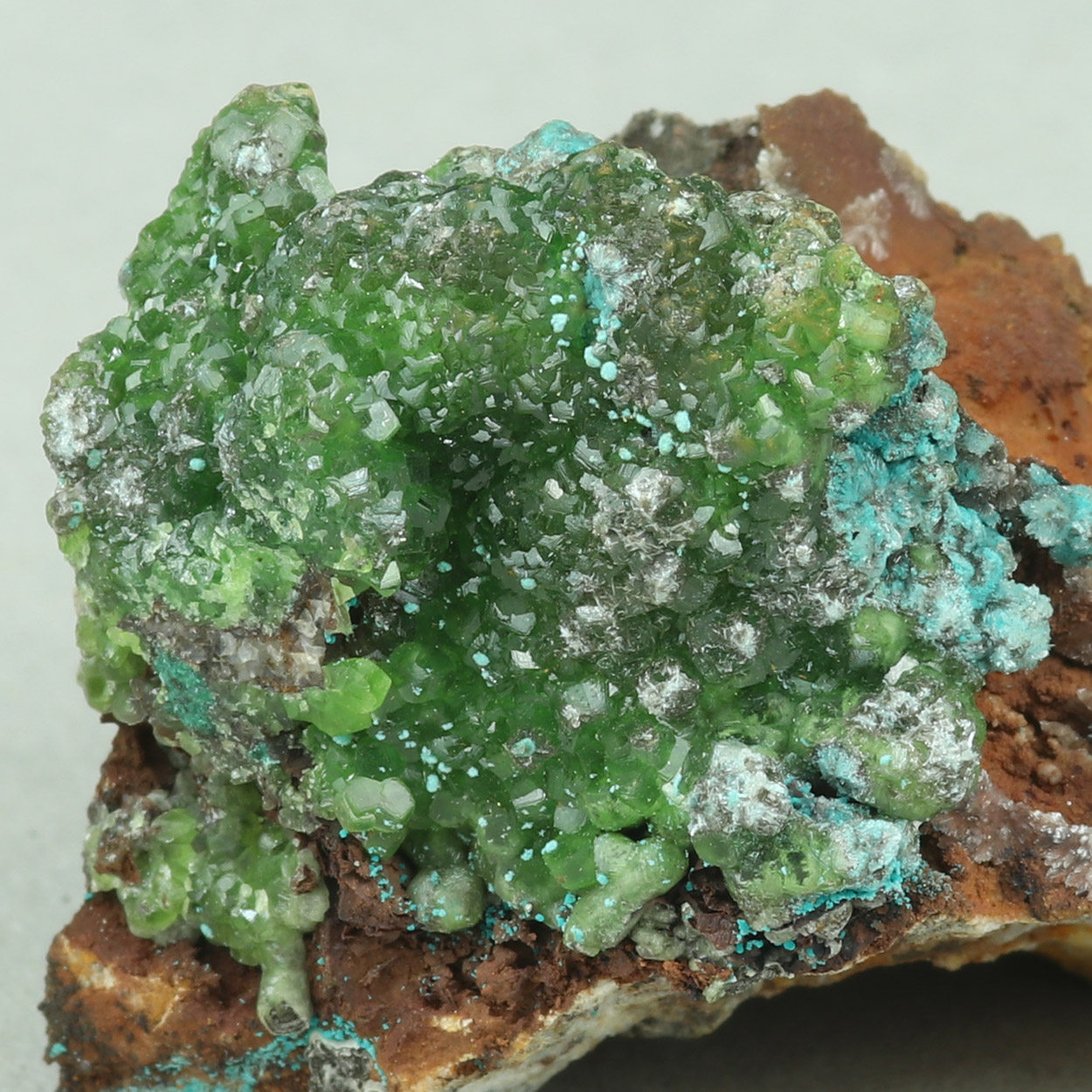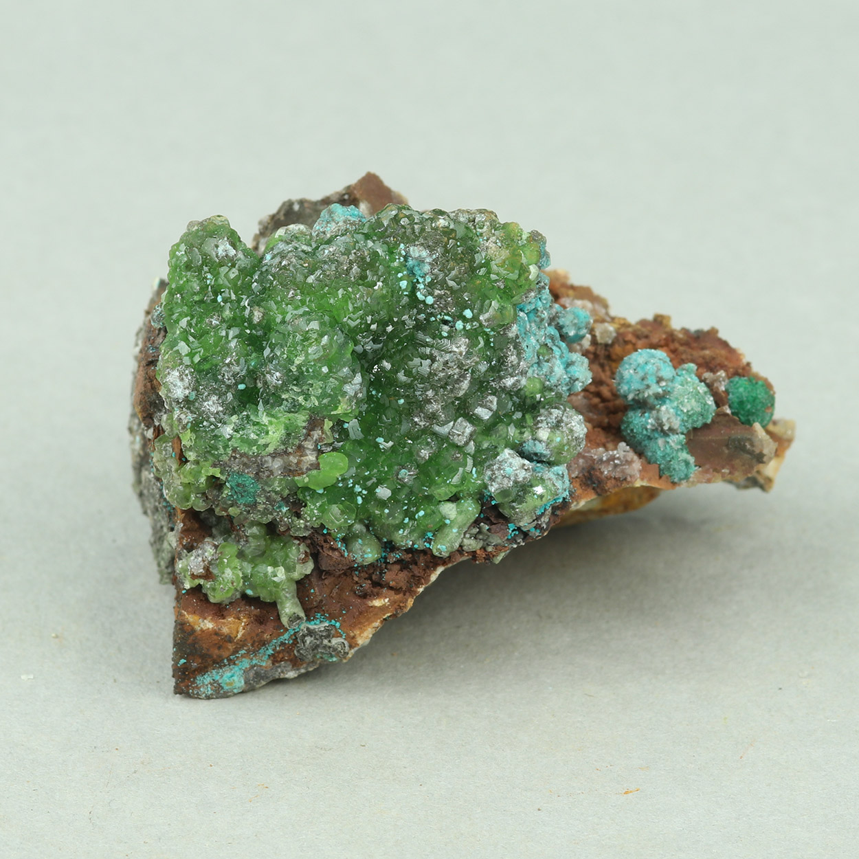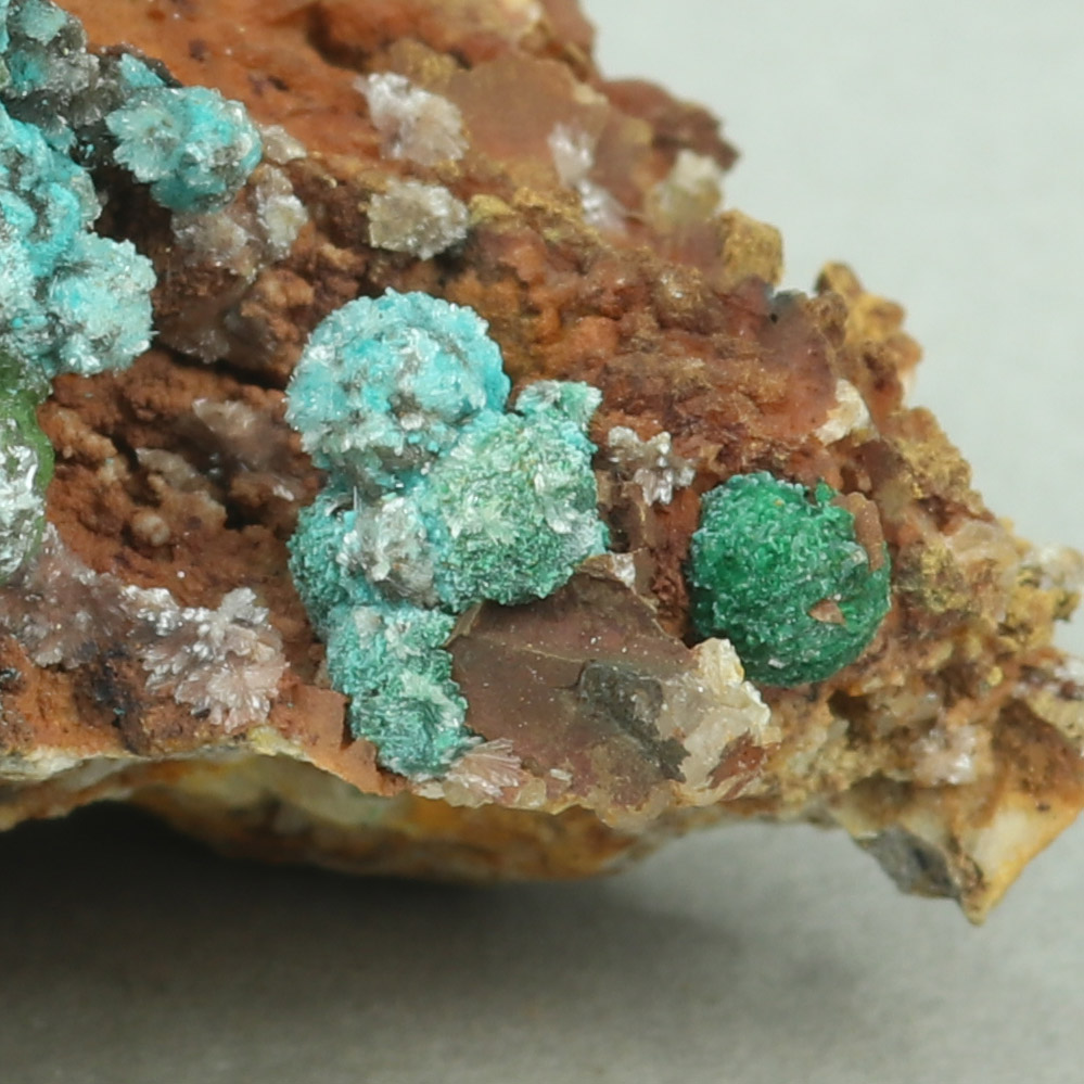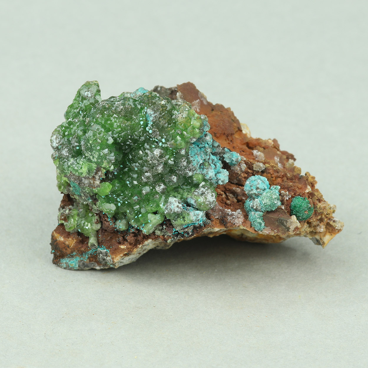 Excellent specimen from Lavrion, with vivid-green, cuprian smithsonite, balls of malachite and/or aurichalcite after azurite on gossan matrix.