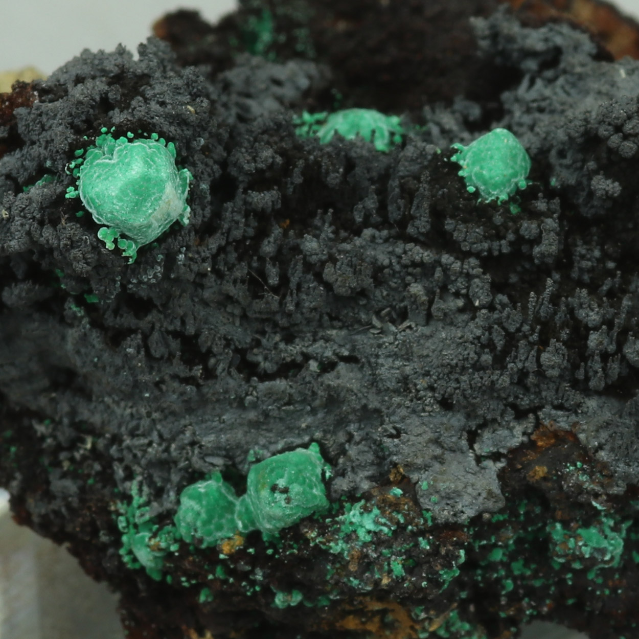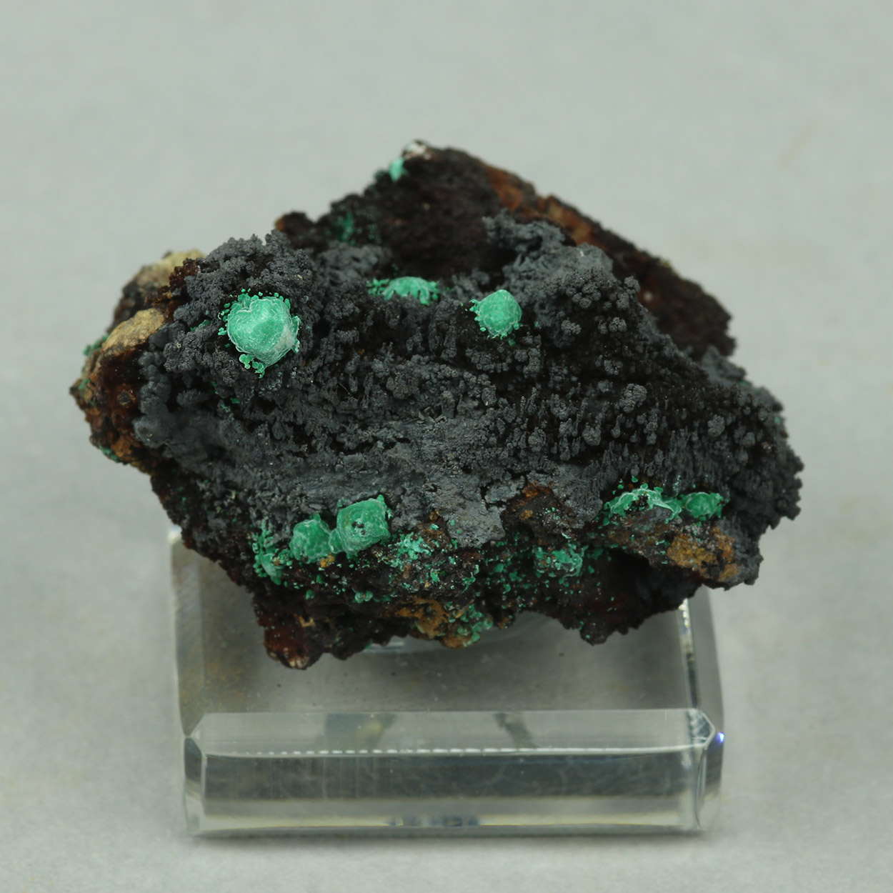 Cuprite is rare from Lavrion and this is a good example with cuprite crystals covered or replaced with malachite, on goethite.