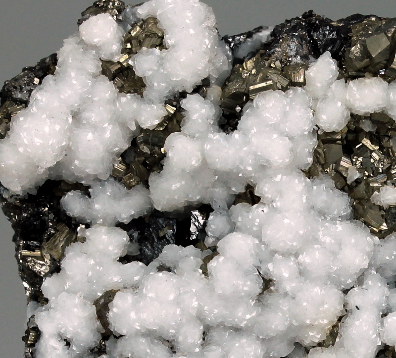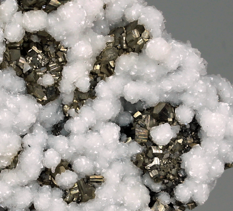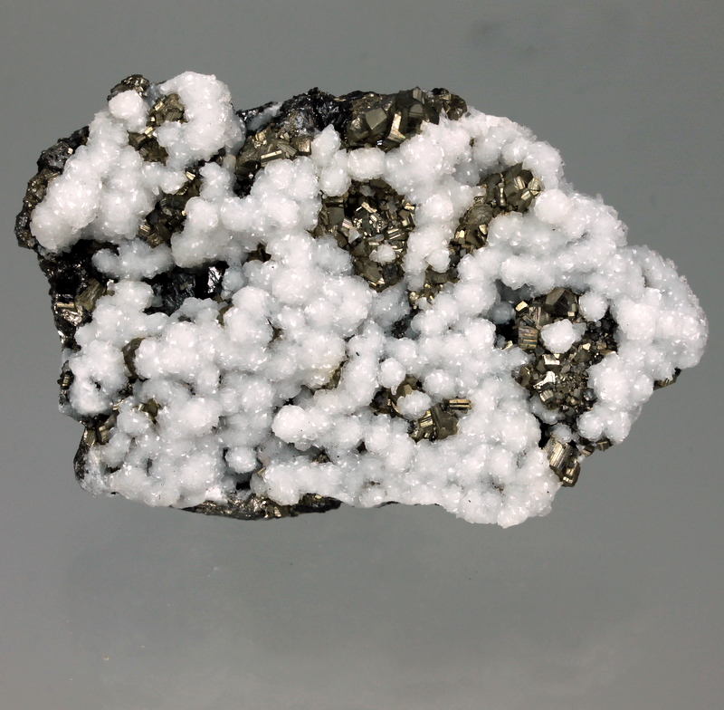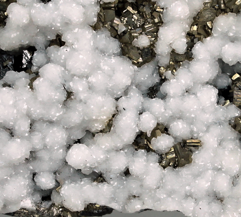 Snow white and lustrous botryoidal dolomite with golden pyrite cubes, on matrix. Classic specimen from the locality.