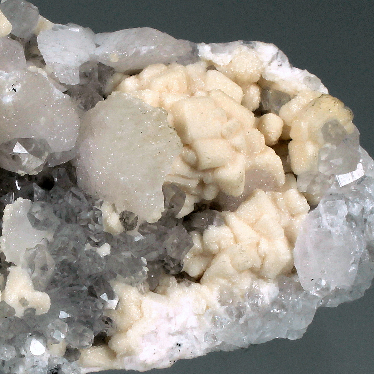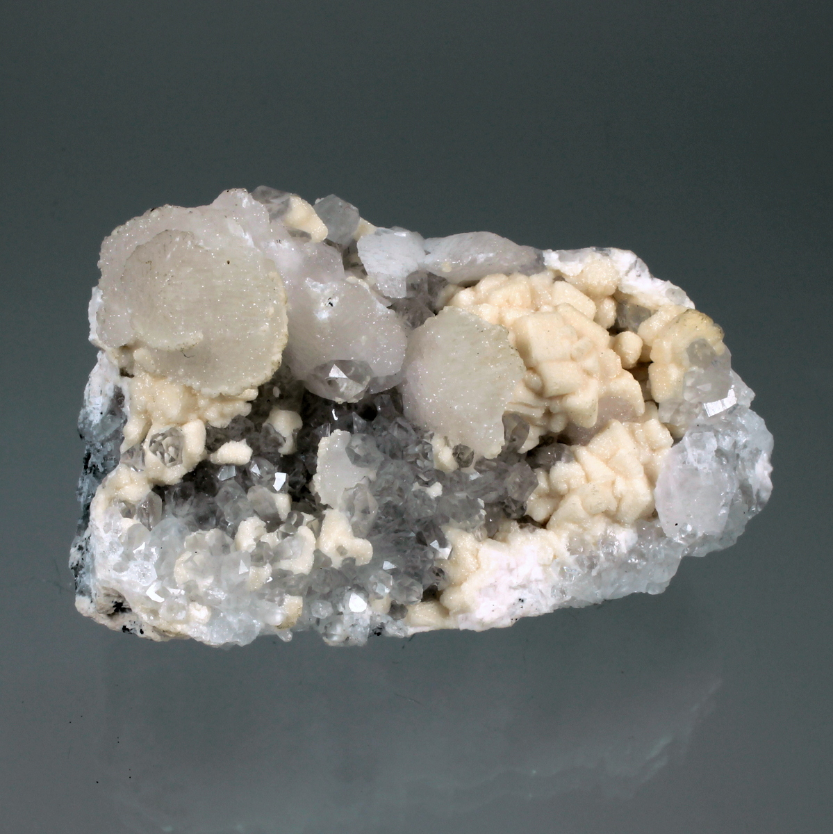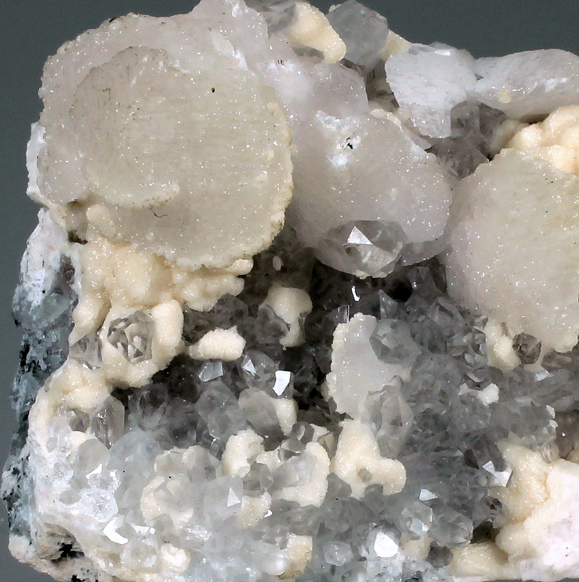 Rhombohedral dolomite crystals with disc shaped manganoan calcite on transparent quartz crystals, all on matrix rock. Classic specimen from the locality, mine is active but specimen collecting is strictly forbidden to miners.