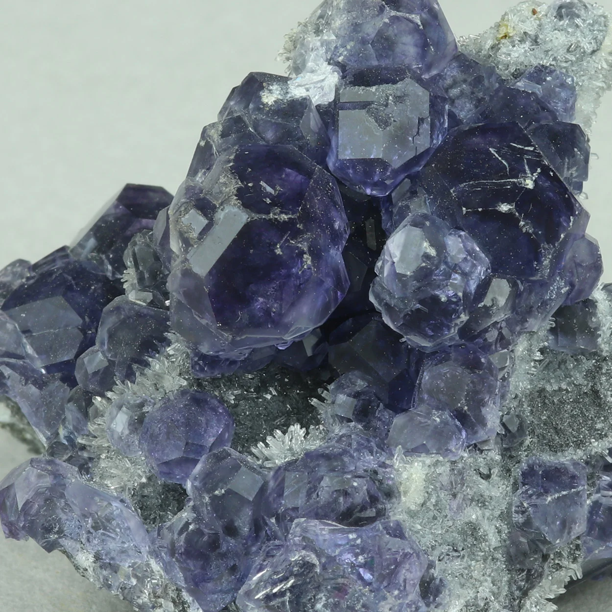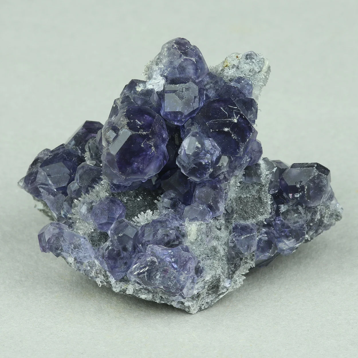 Rich specimen with bluish-purple fluorite with drusy quartz on matrix.