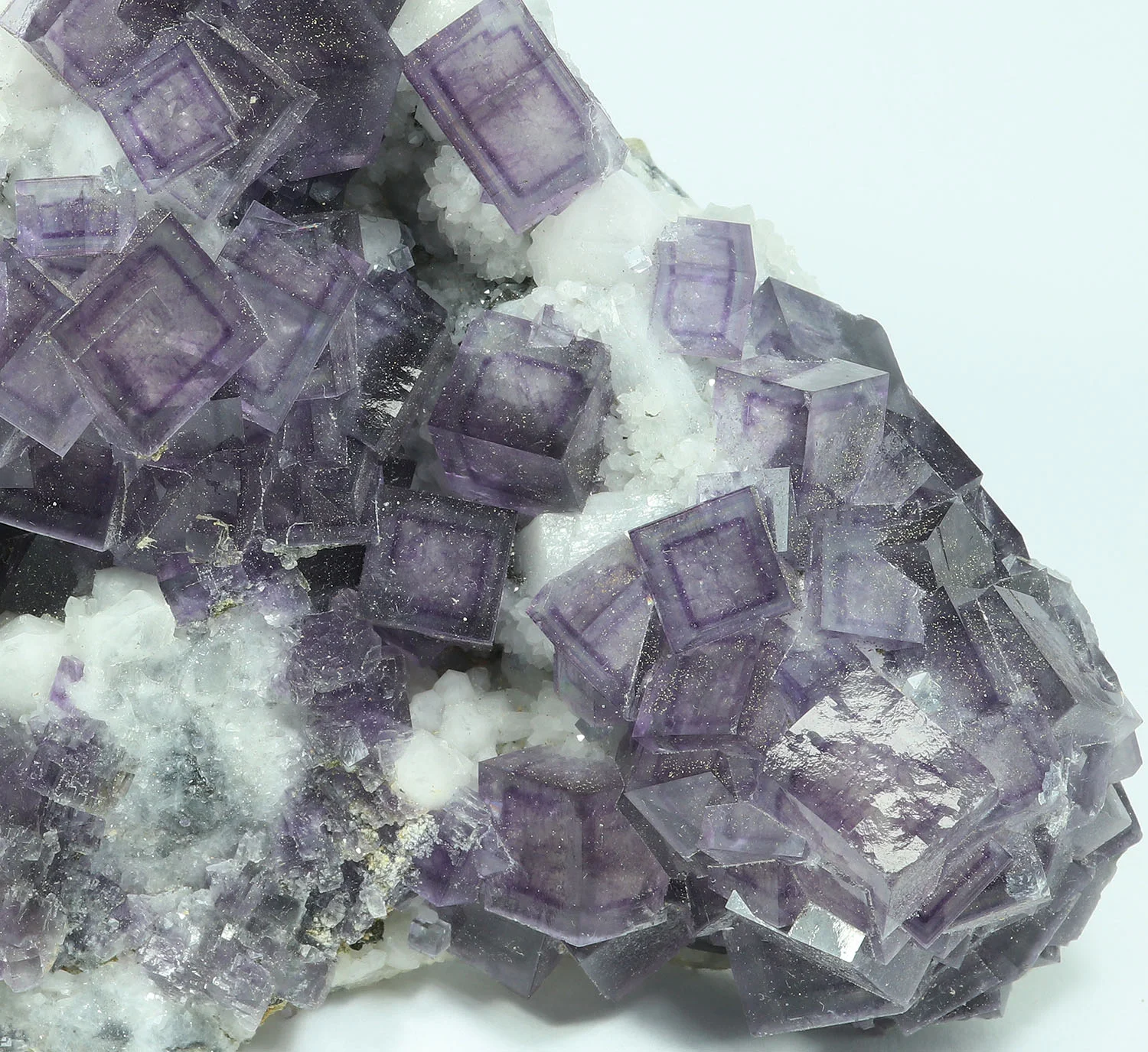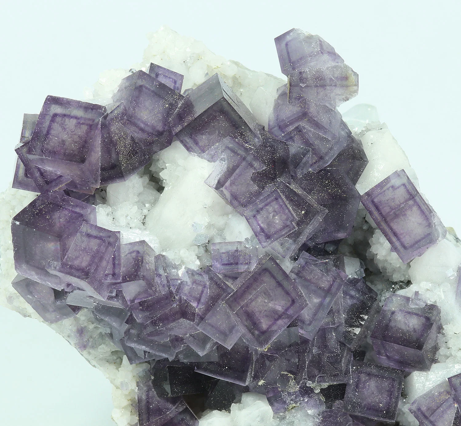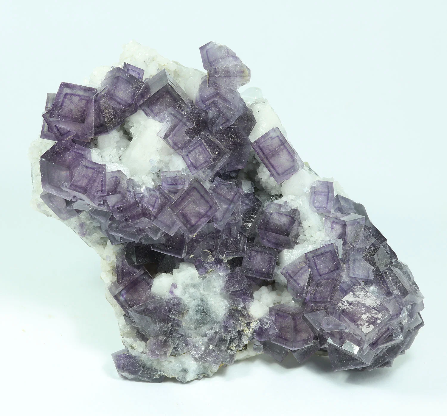 A wonderful, cabinet-sized specimen that hosts dozens of sharp purple fluorite crystals with sharp phantoms. A really cool fluorite specimen from China.