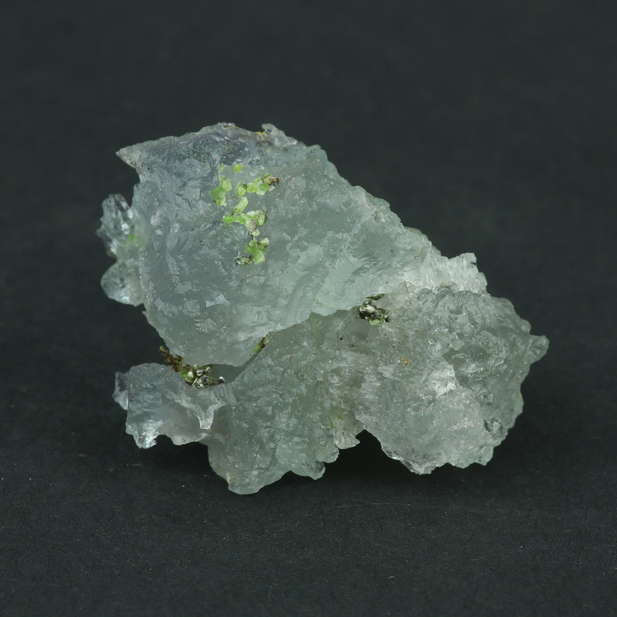 Cute, naturally etched fluorite crystal with minor green smithsonite and tiny bits of blue aurichalcite on it.