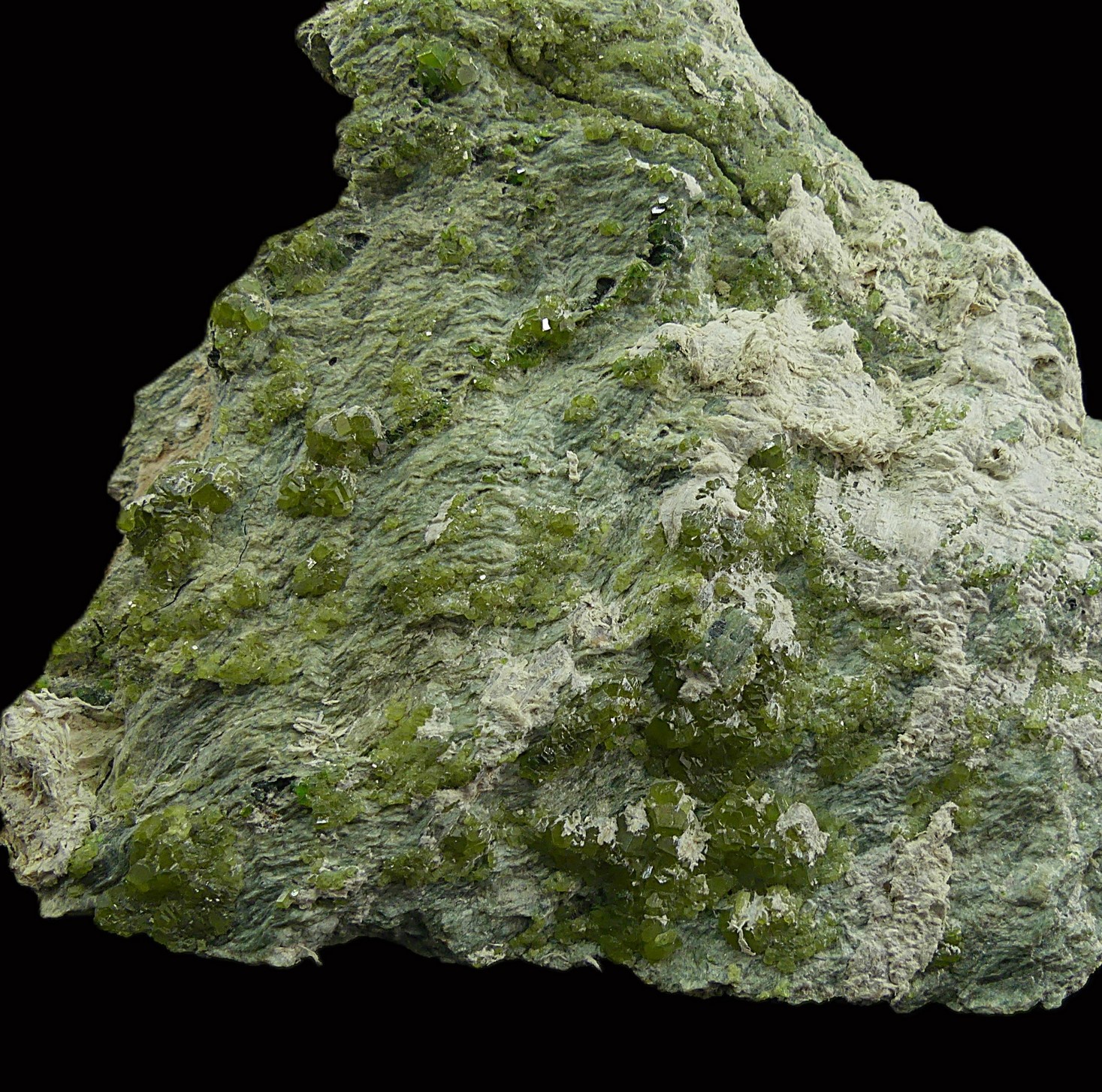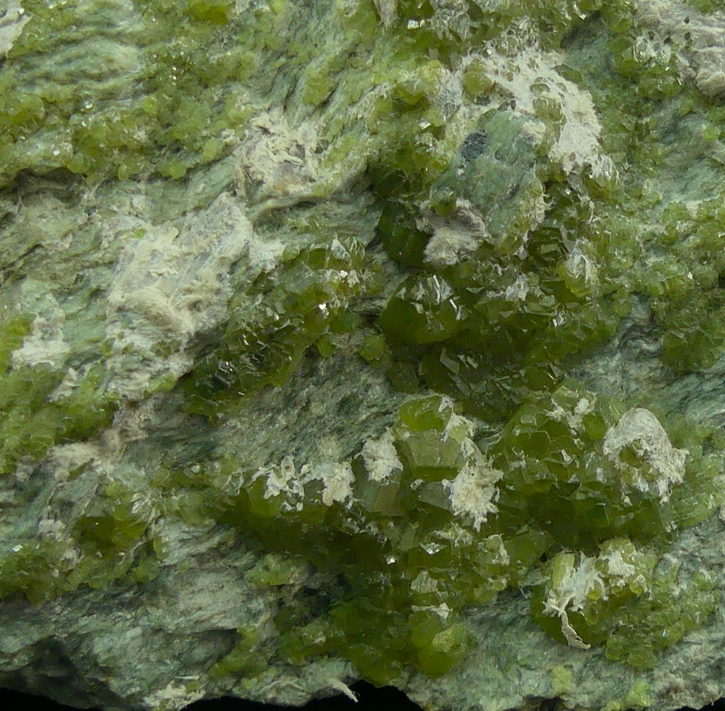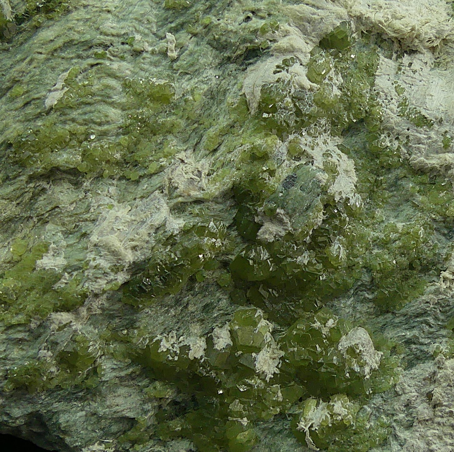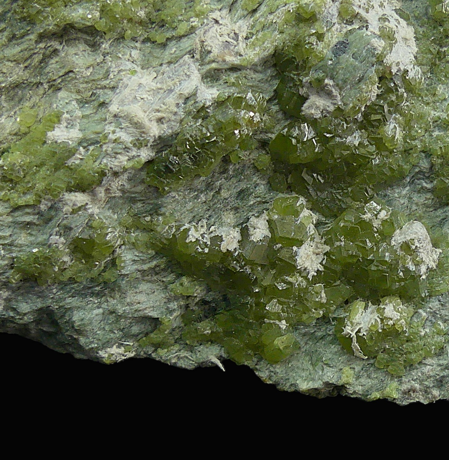 Very nice group of demantoid garnet crystals in a matrix with some traces of asbestos, a typical specimen from the Italian Alps, found in the 1990s