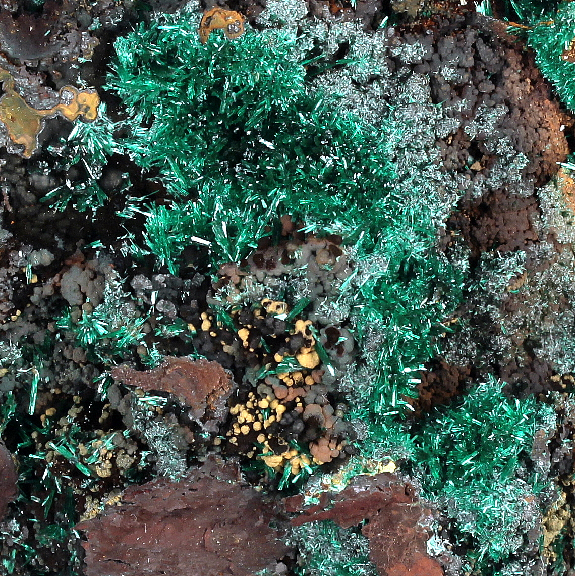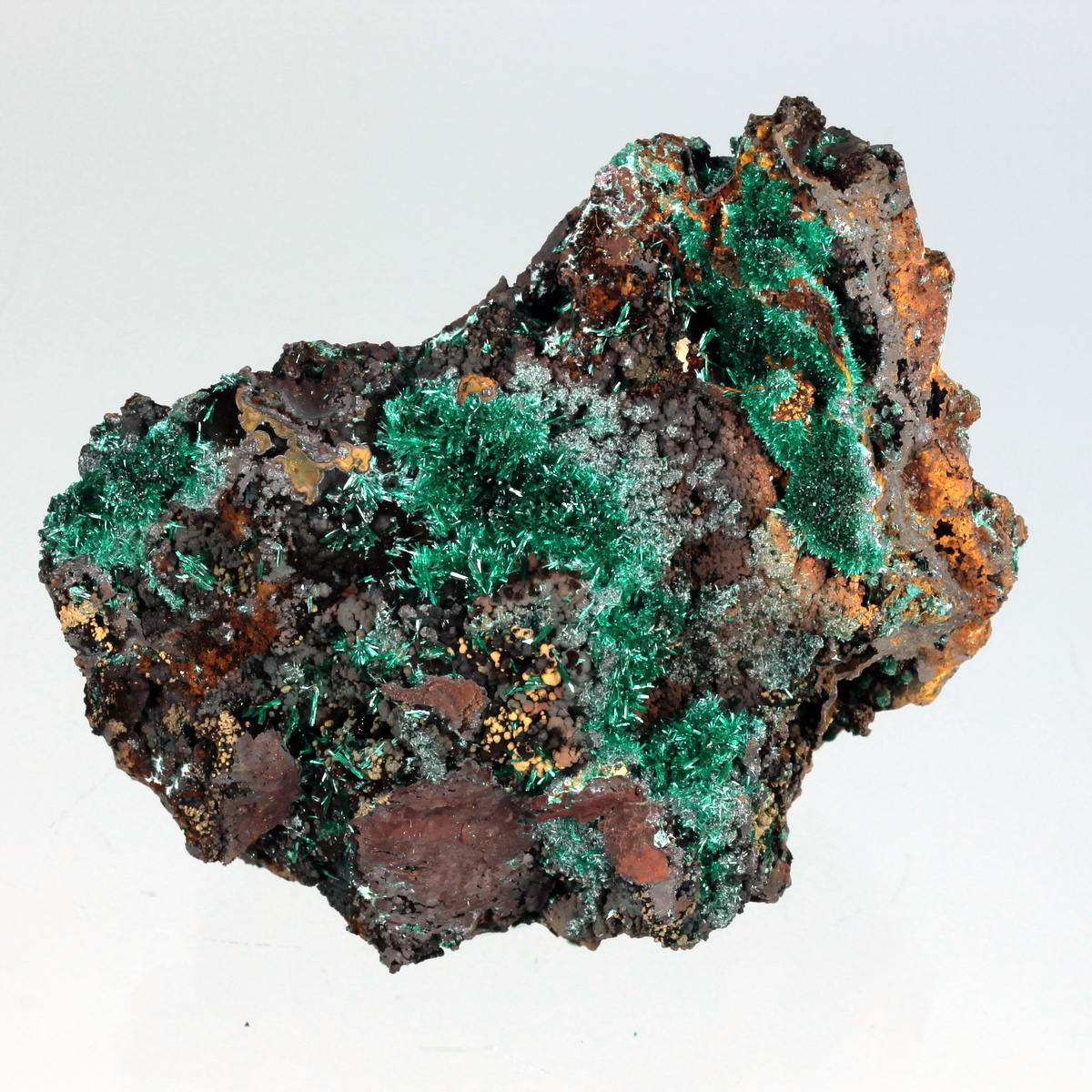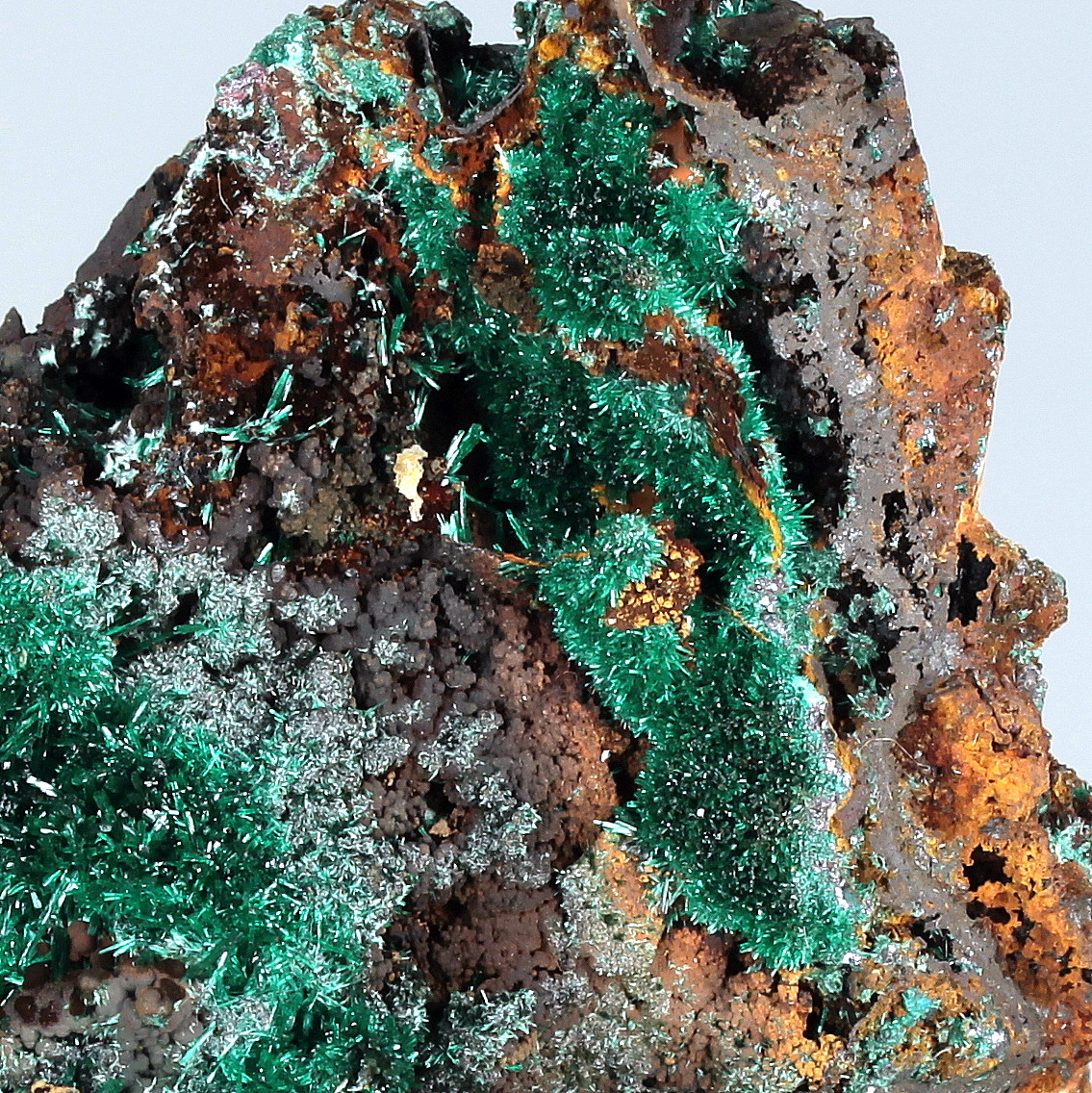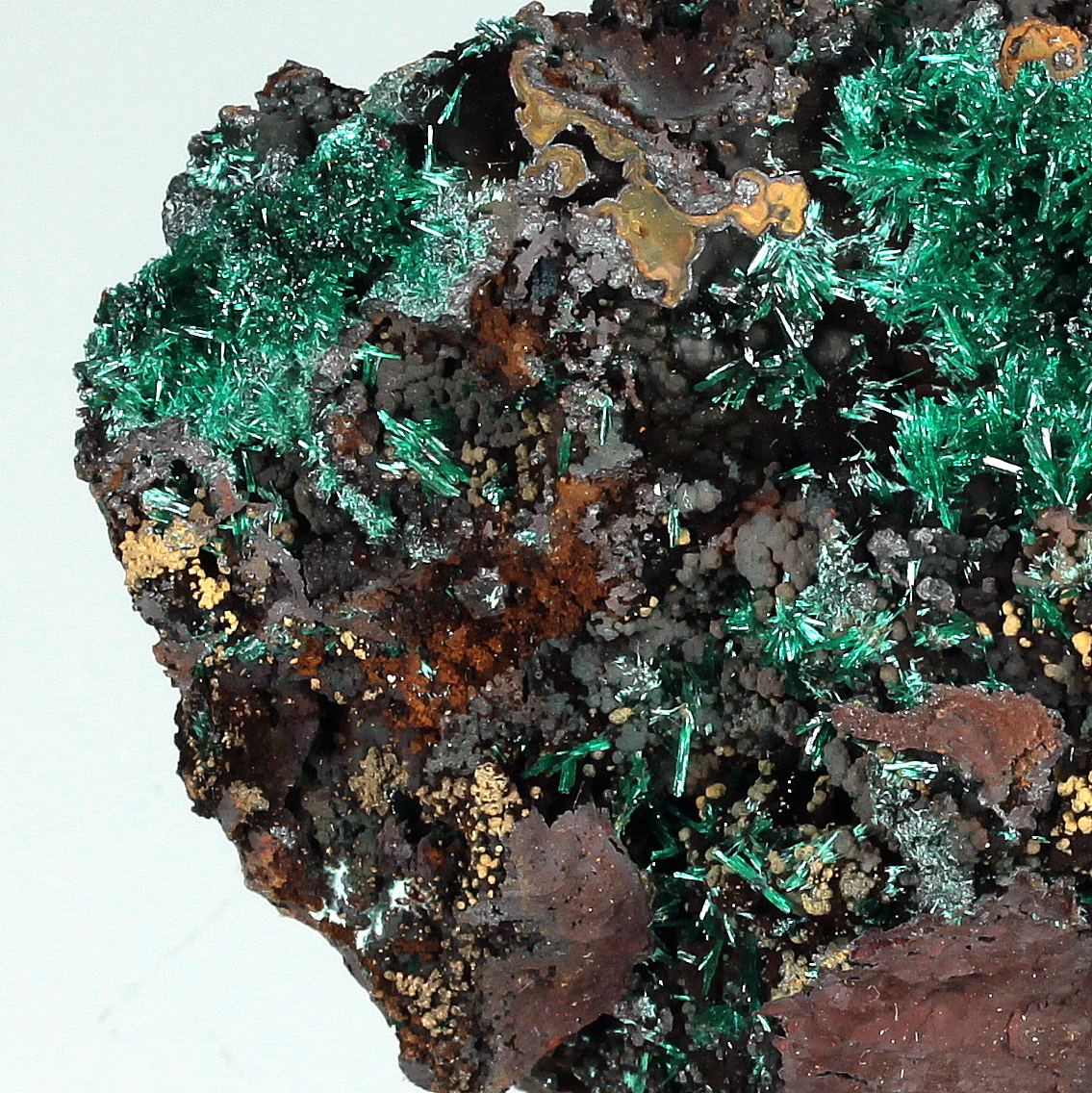 Groups of bright green acicular malachite crystals of high silky luster, nicely arranged on hard limonite matrix surface.