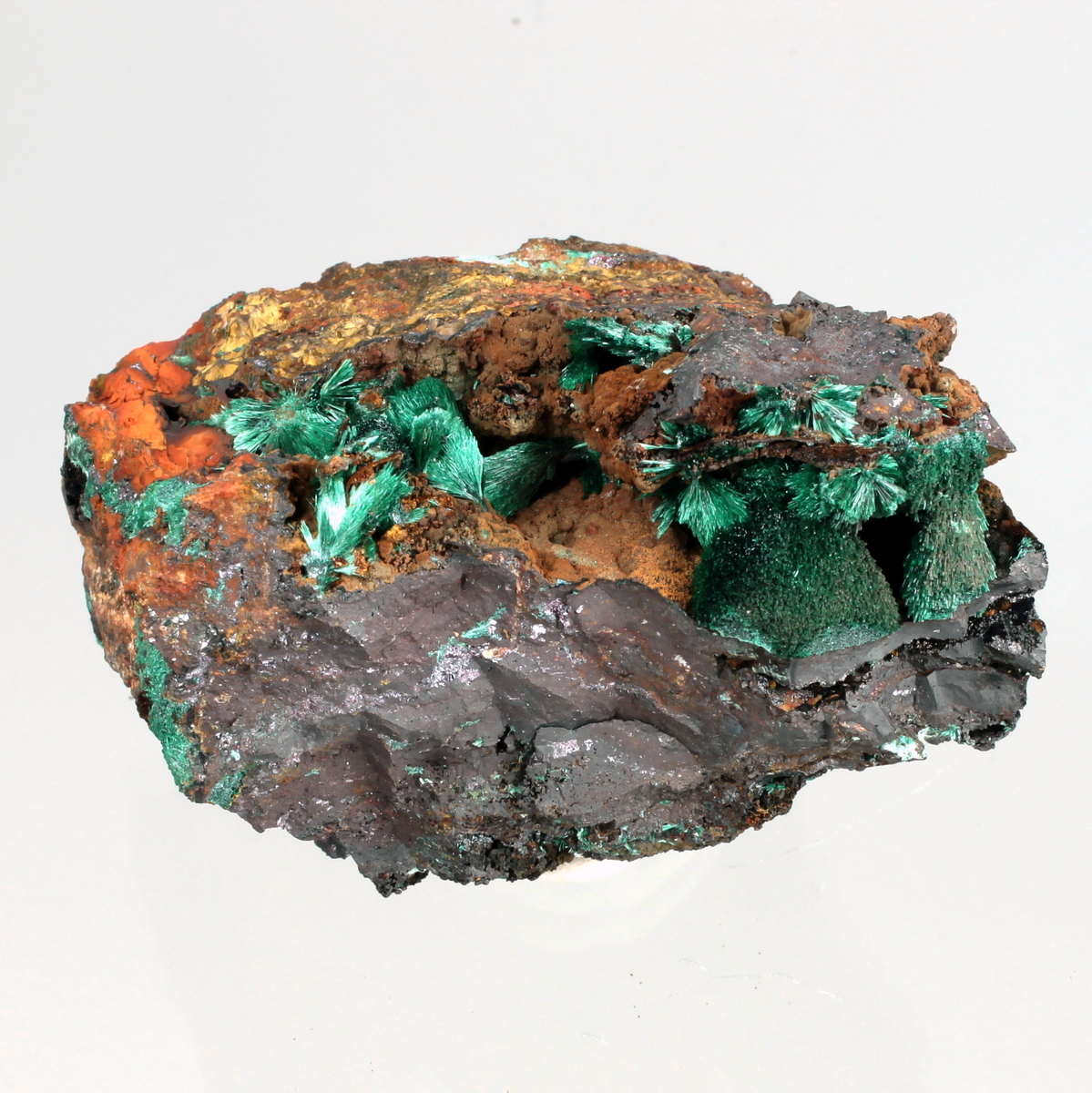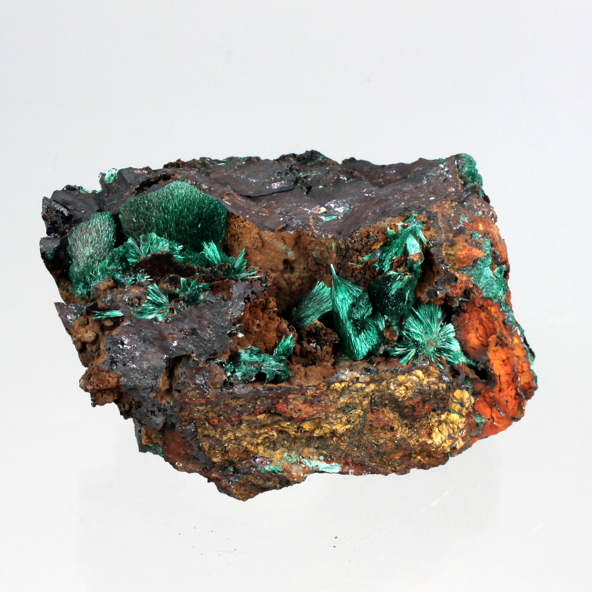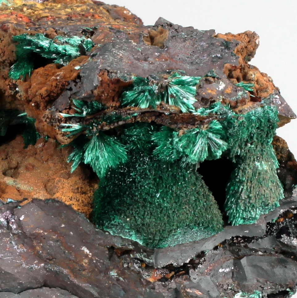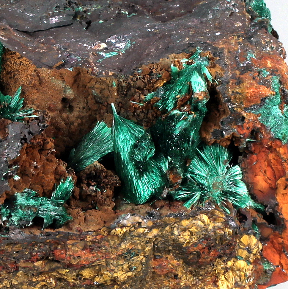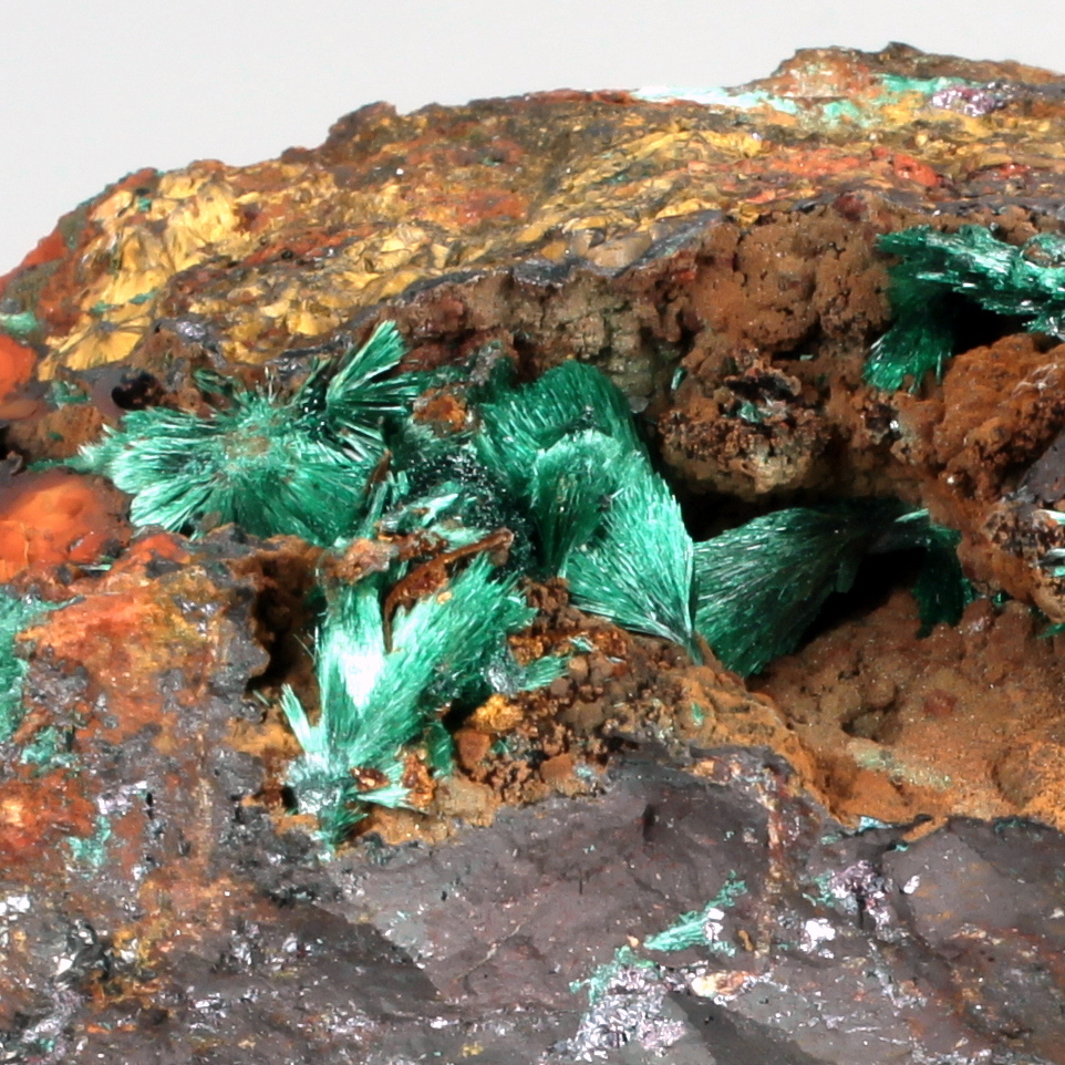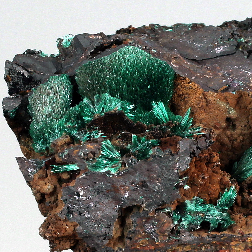 Intense green and lustrous acicular malachite crystals on matrix that is rich in massive cuprite and sporadic grains of native Cu.