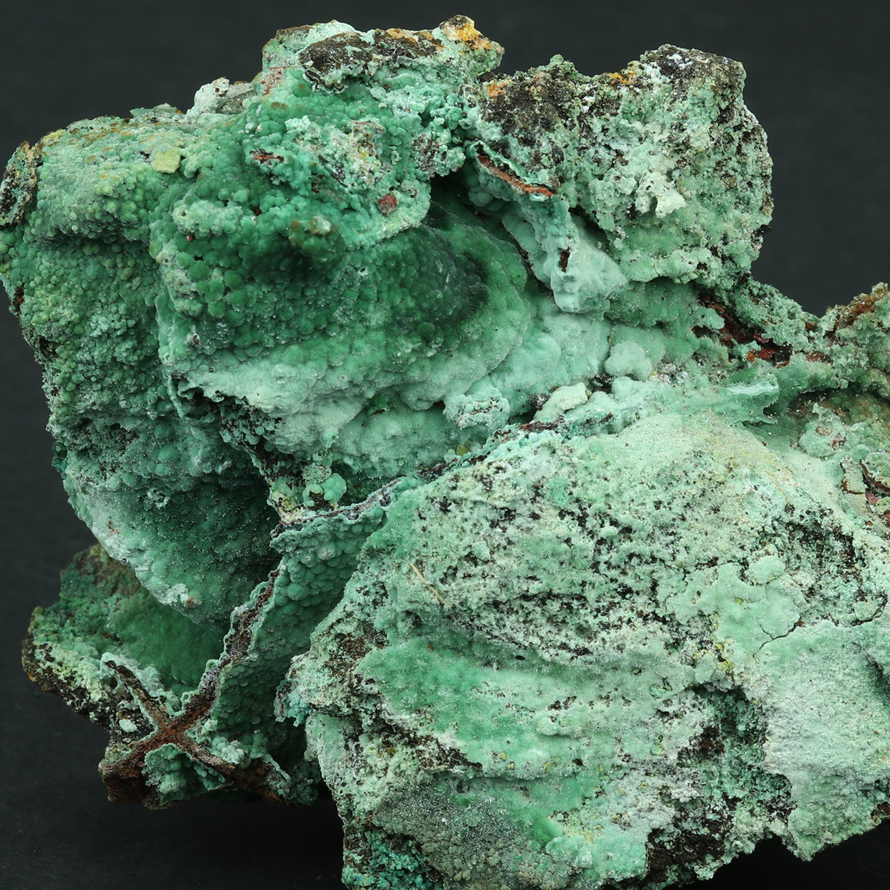 Rich specimen with areas full of green olivenite. From a recent find in the Hilarion mine.