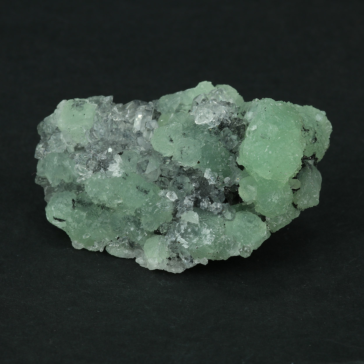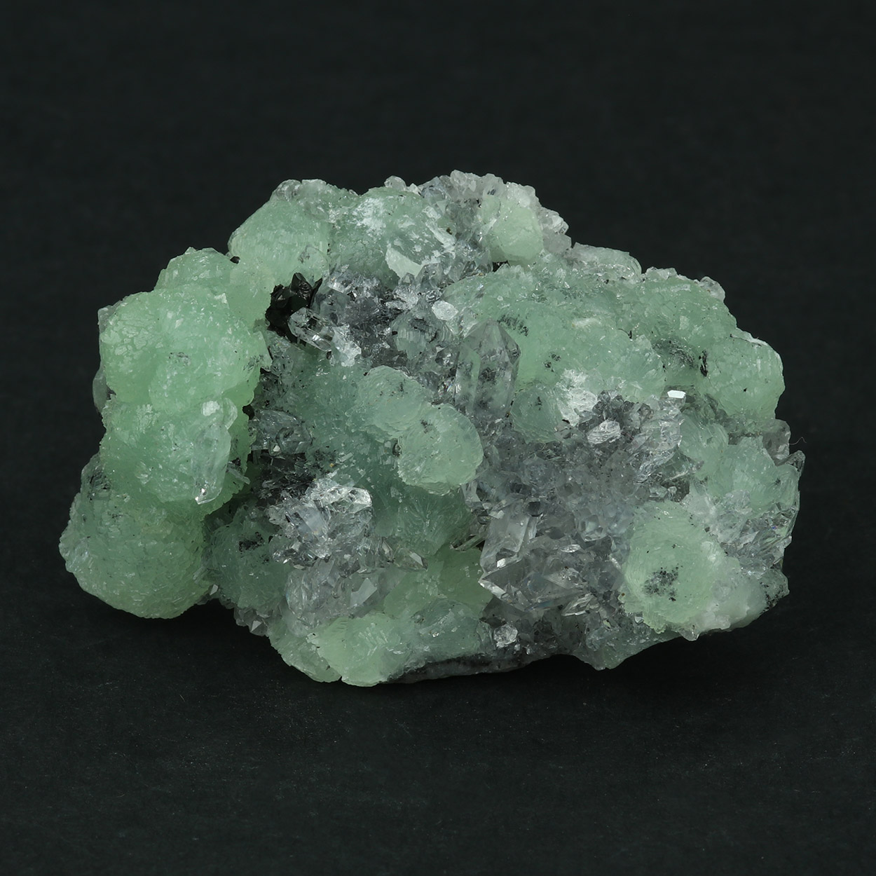 Nice combination of light green, gemmy prehnite on quartz from China.
