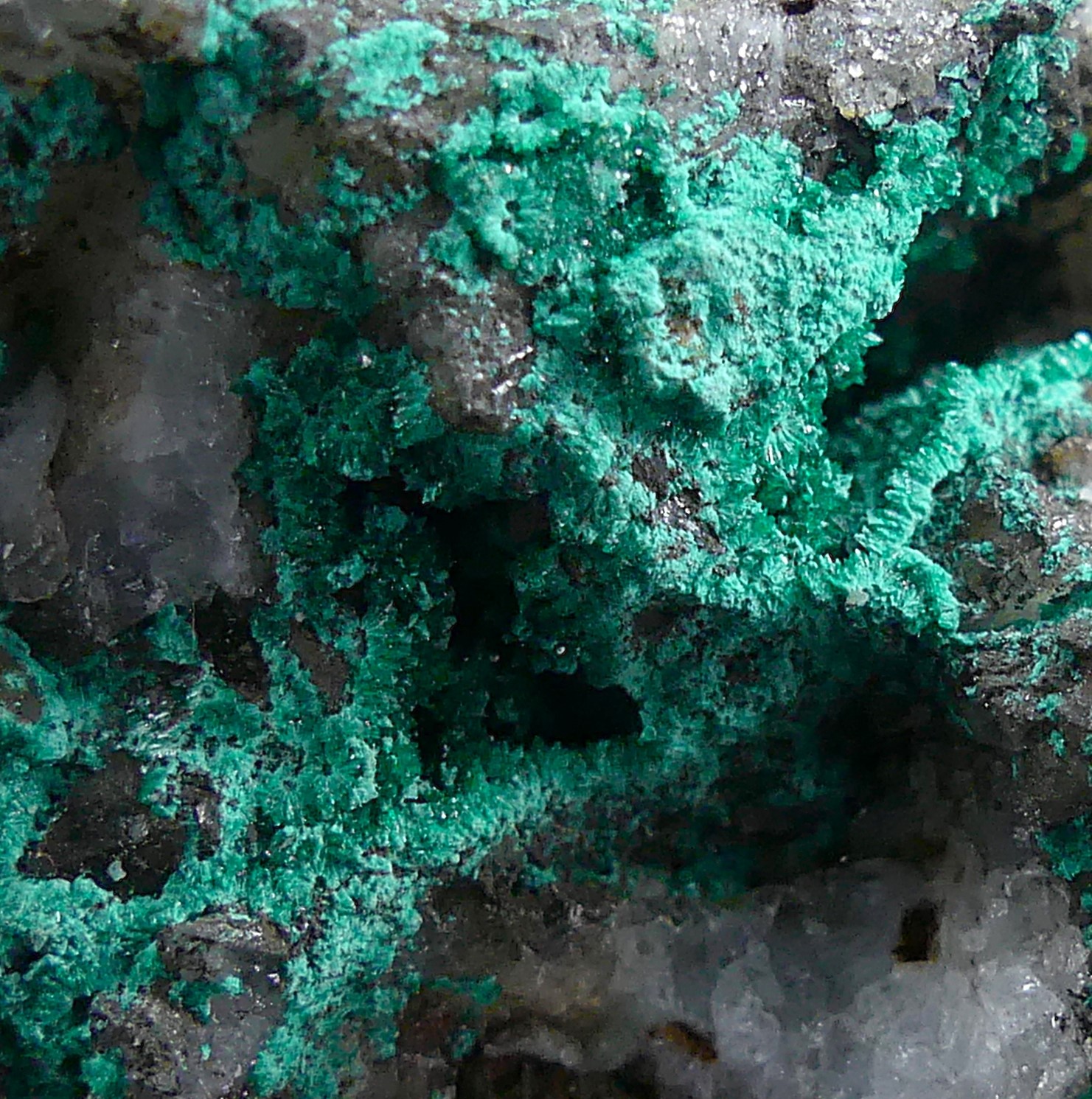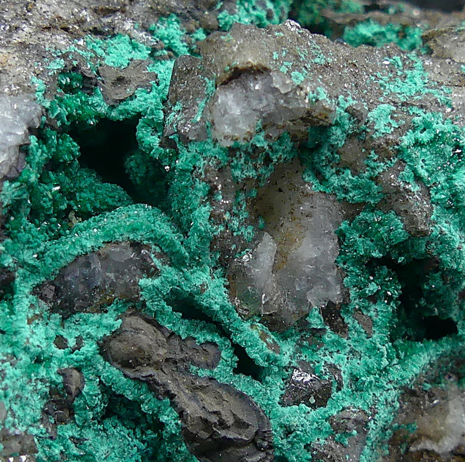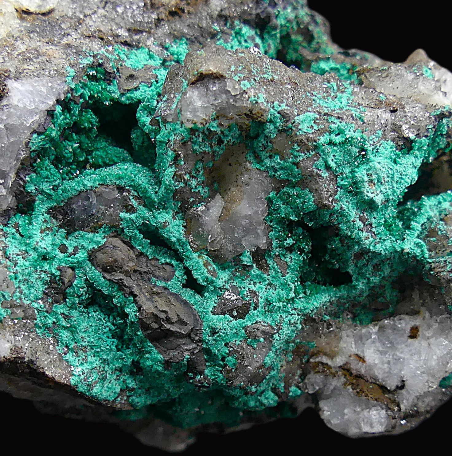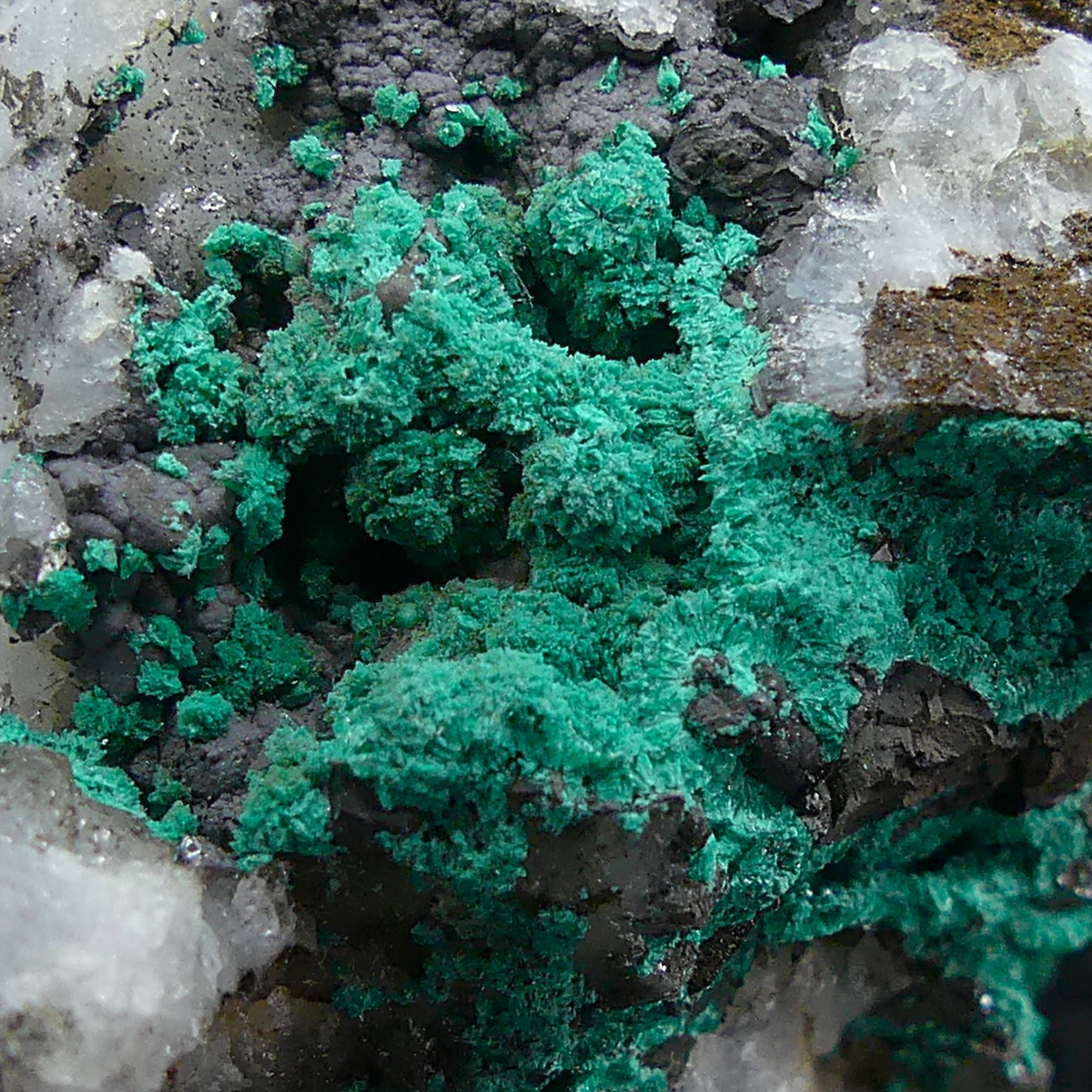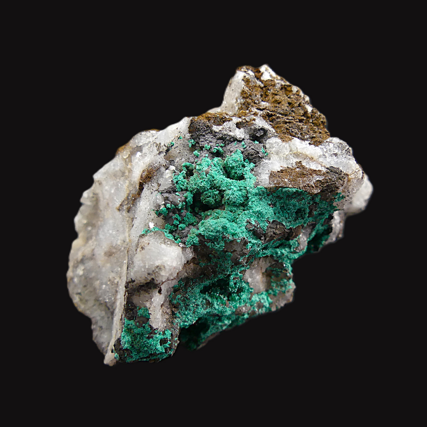 Spectacular and very aesthetic group of pseudomalachite, green libethenite crystals and possibly also reichenbachite crystals on quartz and goethite matrix from this classic Portuguese site.
