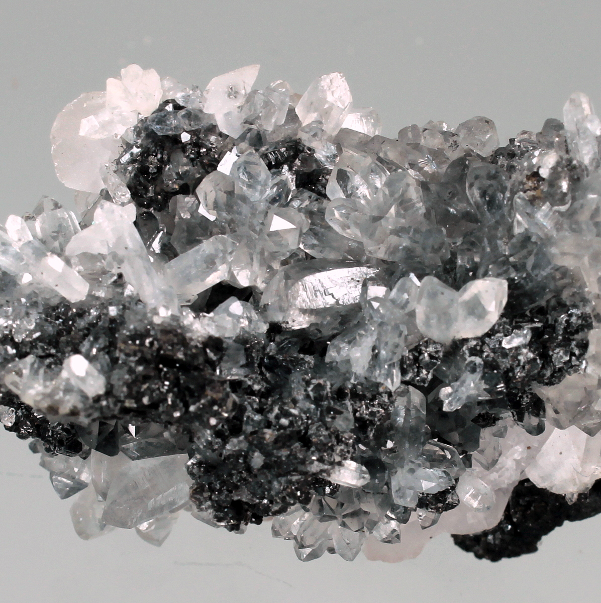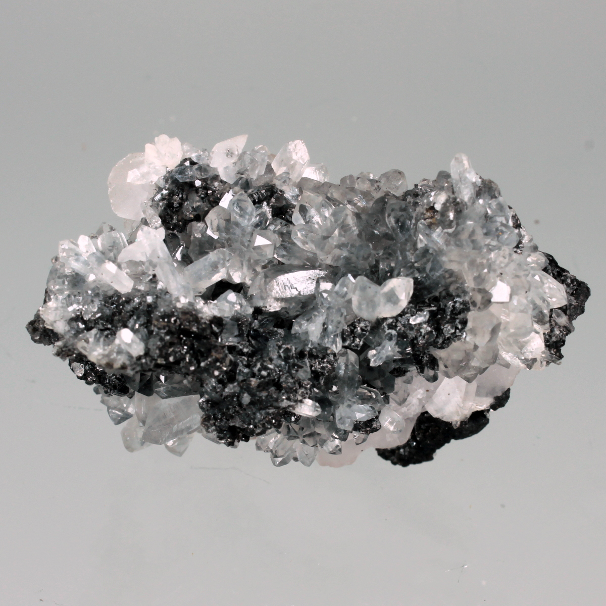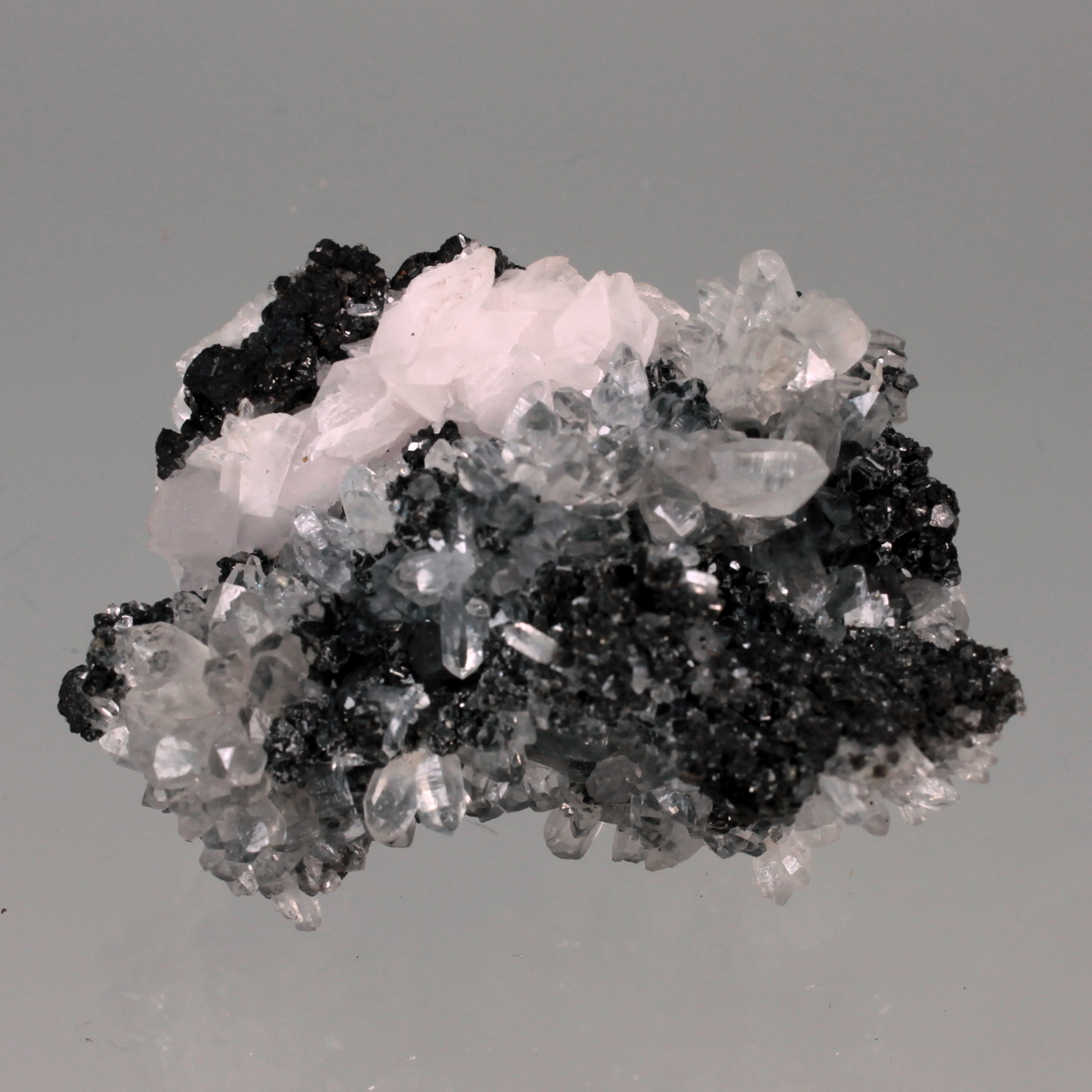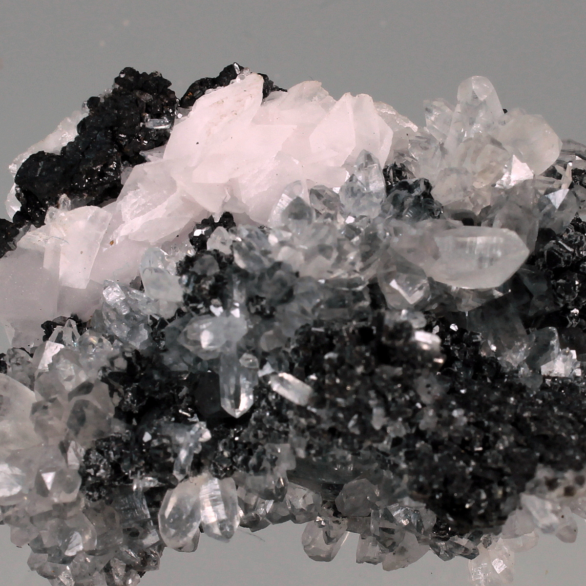 Aesthetic combination of water clear quartz crystals of high glassy luster with black sphalerite crystals and a nice line of disc shaped pinkish manganoan calcite crystals. Classic specimen from the locality, the mine is active but specimen collecting is strictly forbidden to the miners.