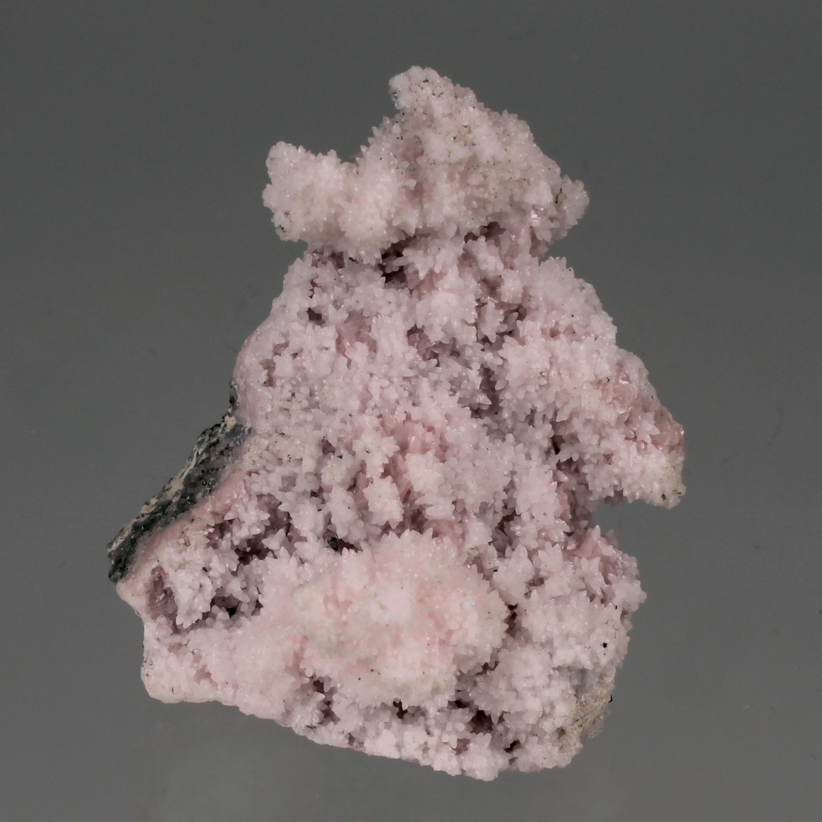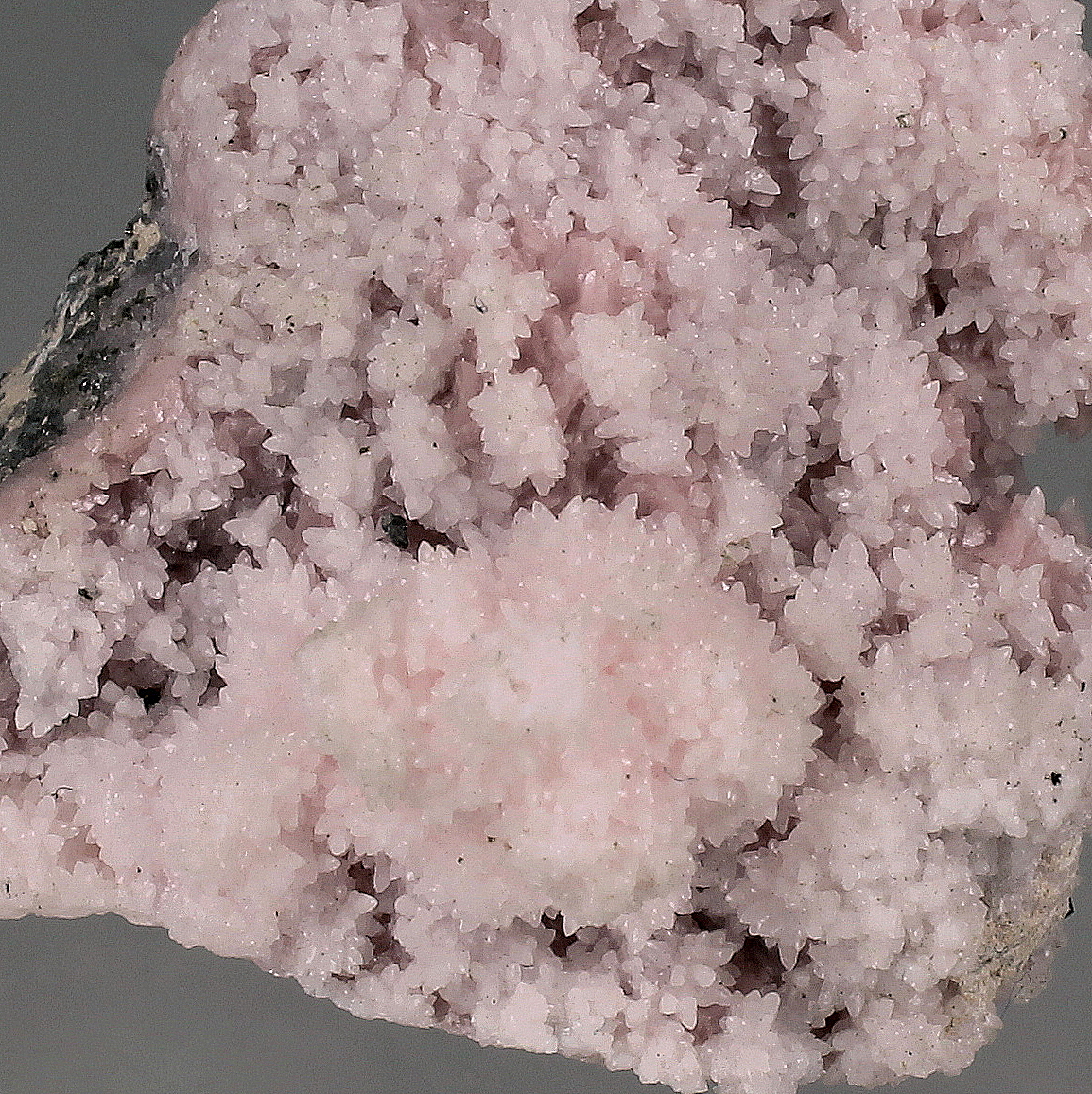 Classic specimen of soft pink rhodochrosite crystals on matrix.