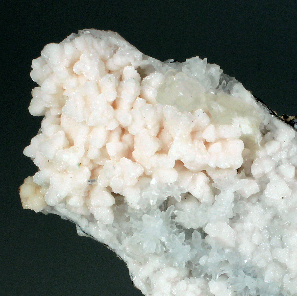 Soft pink rhodochrosite crystals with transparent quartz, white dolomite rhombohedrons and disc shaped manganoan calcite crystals, on matrix rock. Nice multi mineral and classic specimen from the locality.