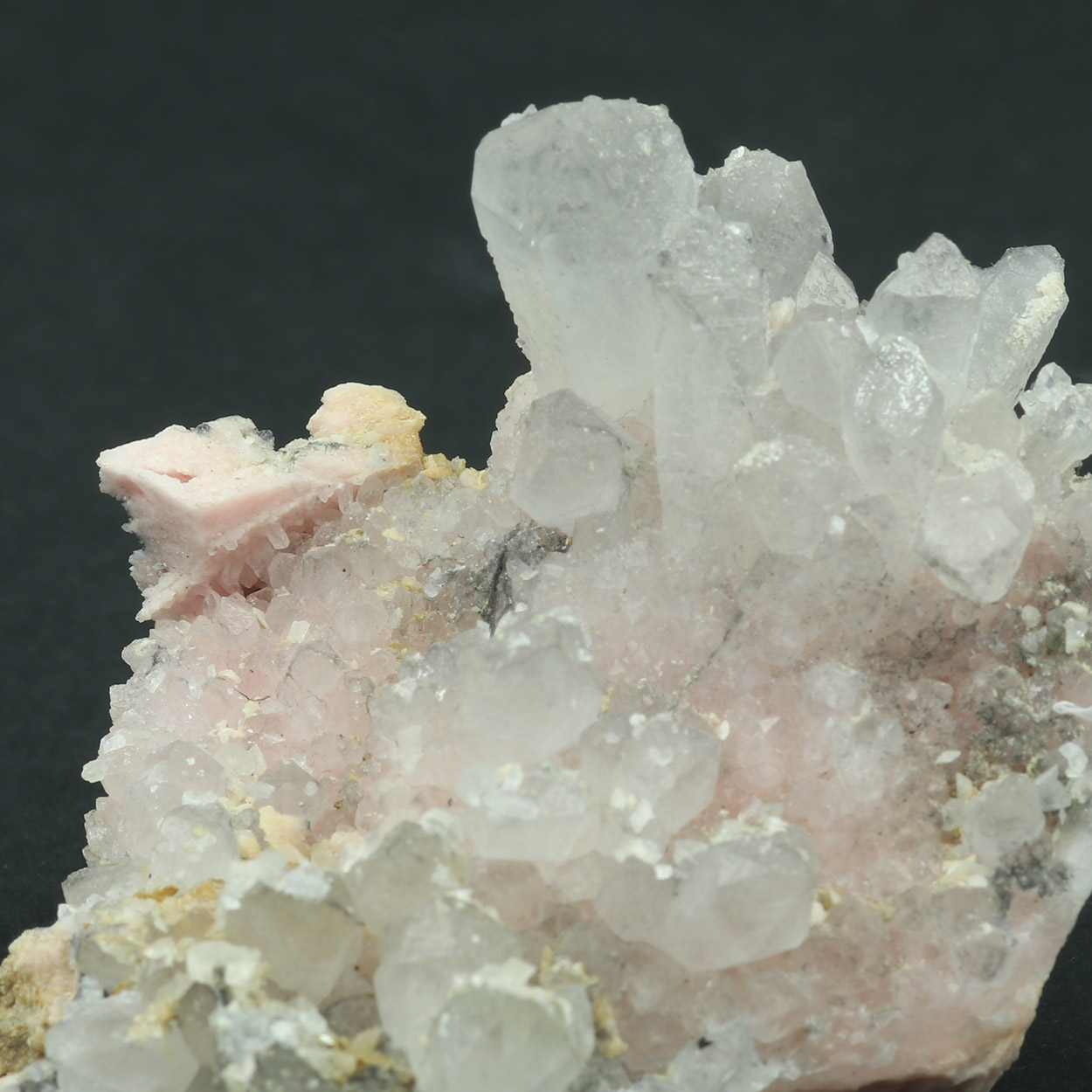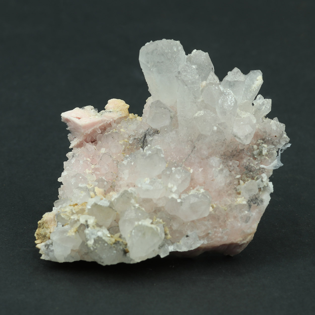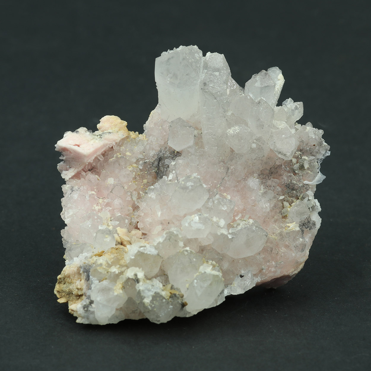 Here is a good old specimen from the Kassandra mines. Pink rhodochrosite with quartz crystals covering most of it.
