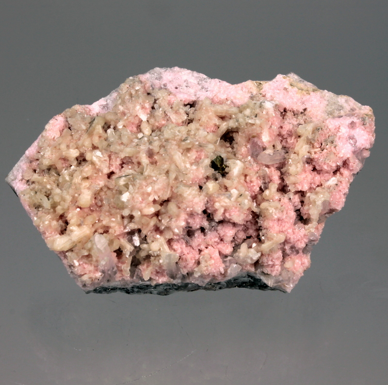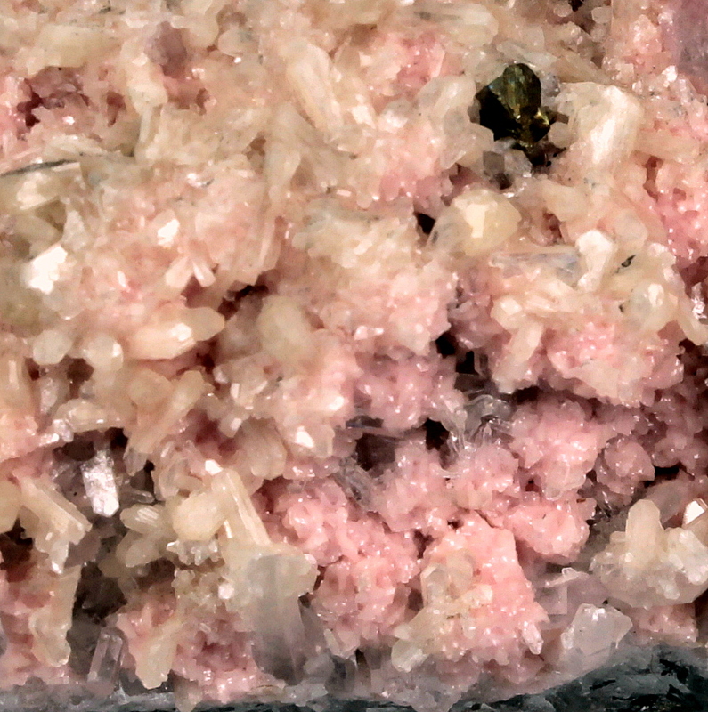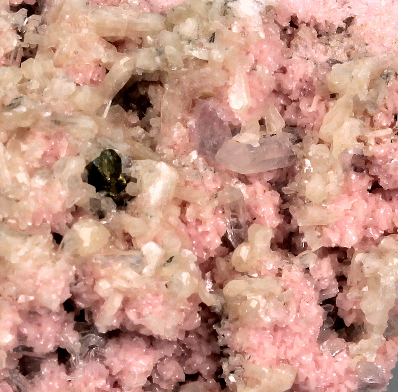Intense pink rhodochrosite with stilbite, chalcopyrite and clear quartz crystals.