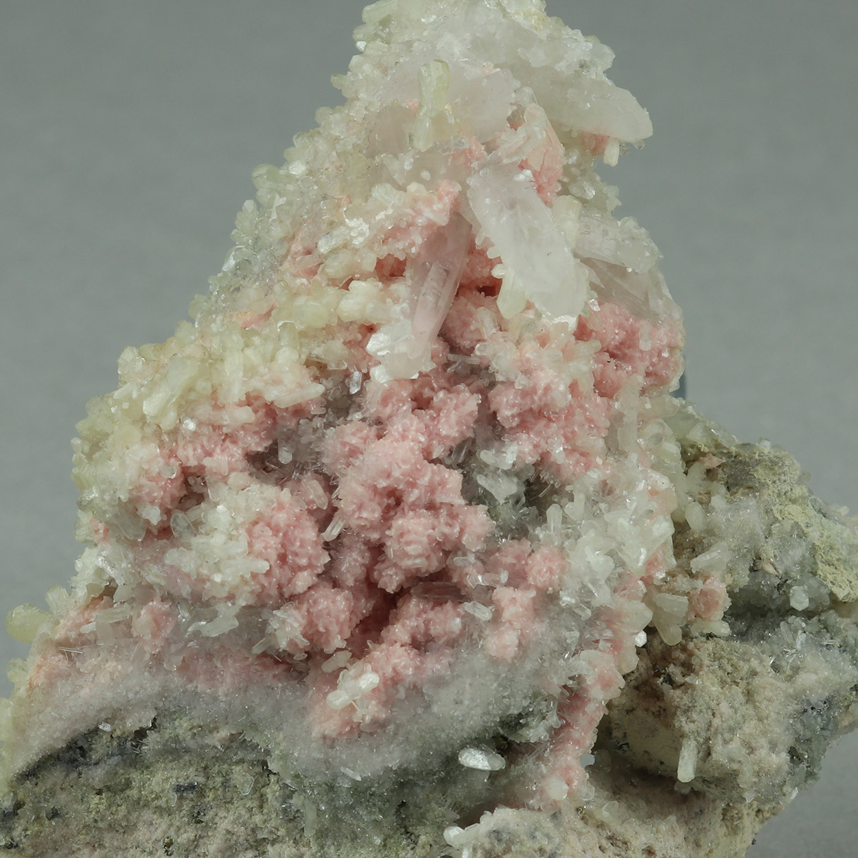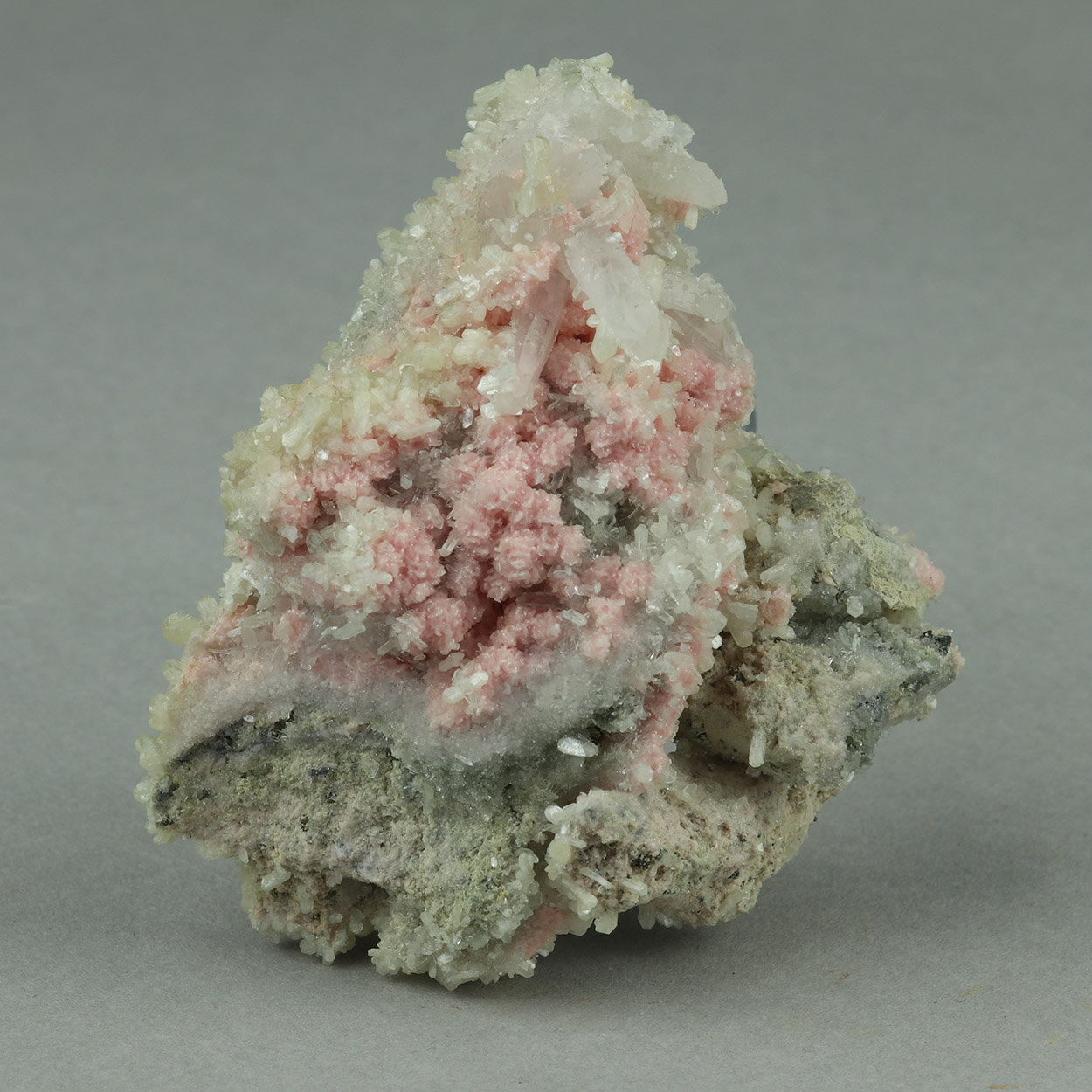 Beautiful combination of pink rhodochrosite crystals with little crystals of stilbite and minor quartz crystals. Nice specimen from Bulgaria.