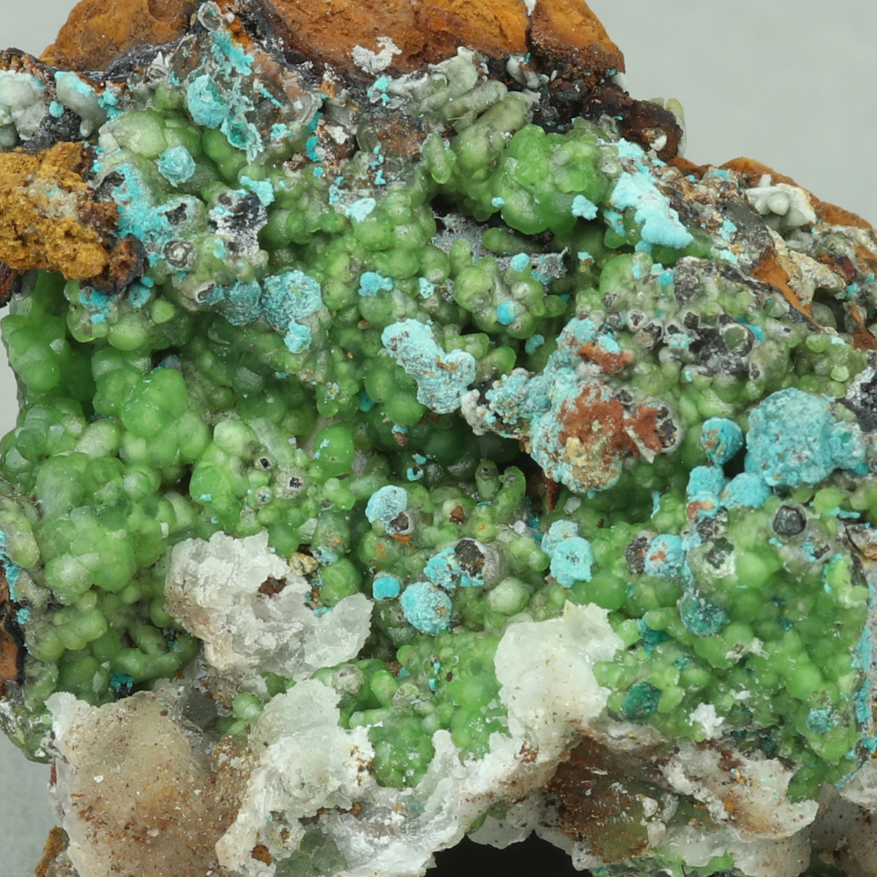 Nice combination of green, crystallized smithsonite with contrasting light blue aurichalcite.