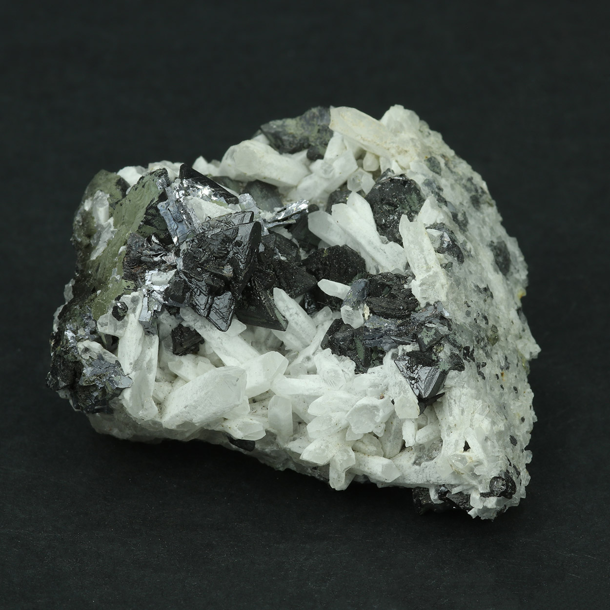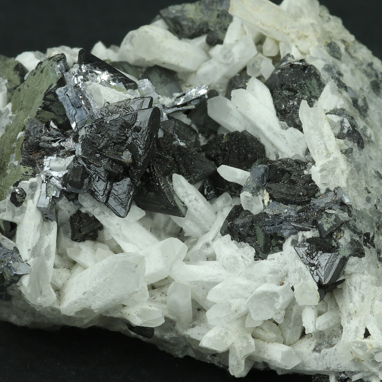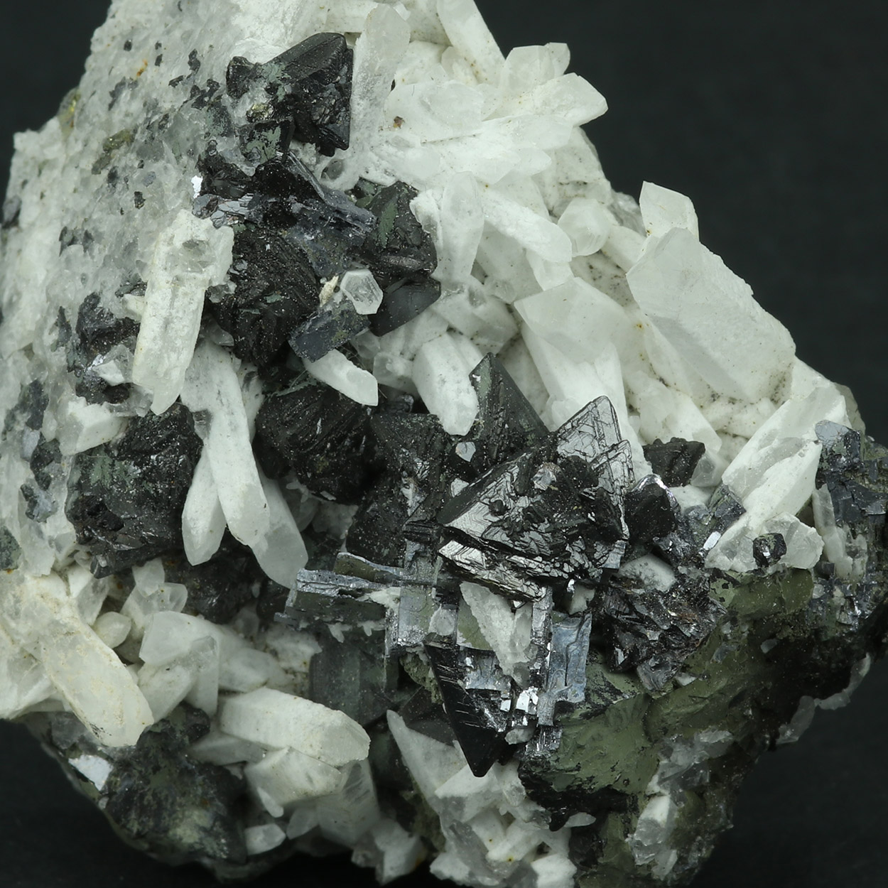 Sharp and lustrous, black crystals of sphalerite on contrasting white quartz.